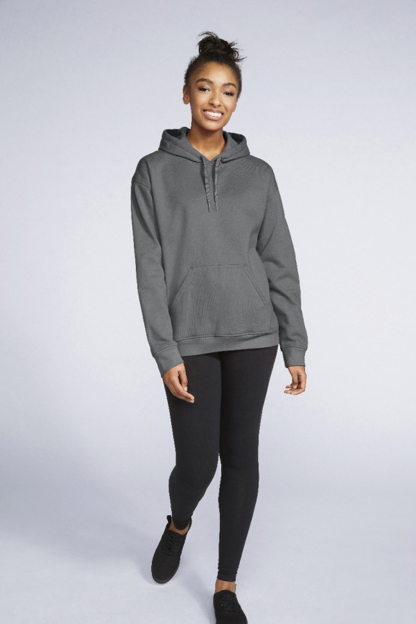 Hanorac cu glugă, din 80% bumbac și 20% poliester, cu buzunar frontal. 285 g/m² (alb 278 g/m²). Produs marca Gildan.