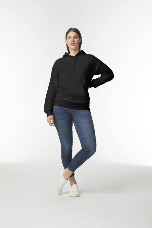 Hanorac cu glugă, din 80% bumbac și 20% poliester, cu buzunar frontal. 285 g/m² (alb 278 g/m²). Produs marca Gildan.