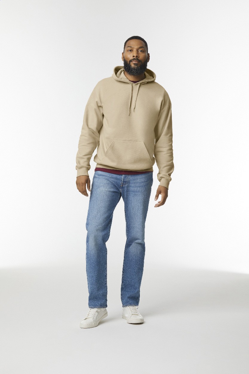 Hanorac cu glugă, din 80% bumbac și 20% poliester, cu buzunar frontal. 285 g/m² (alb 278 g/m²). Produs marca Gildan.