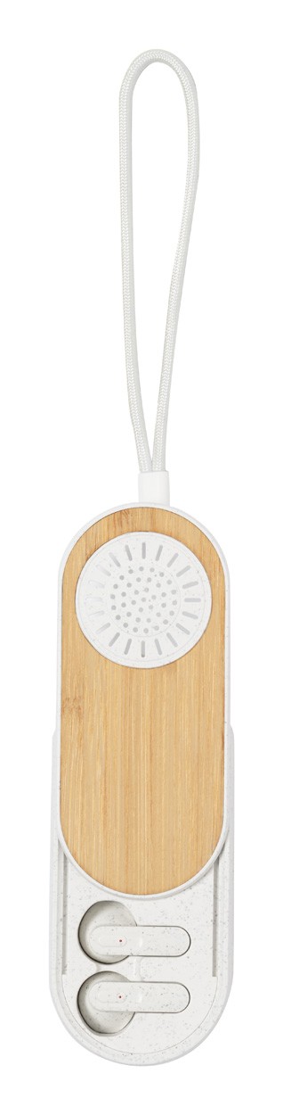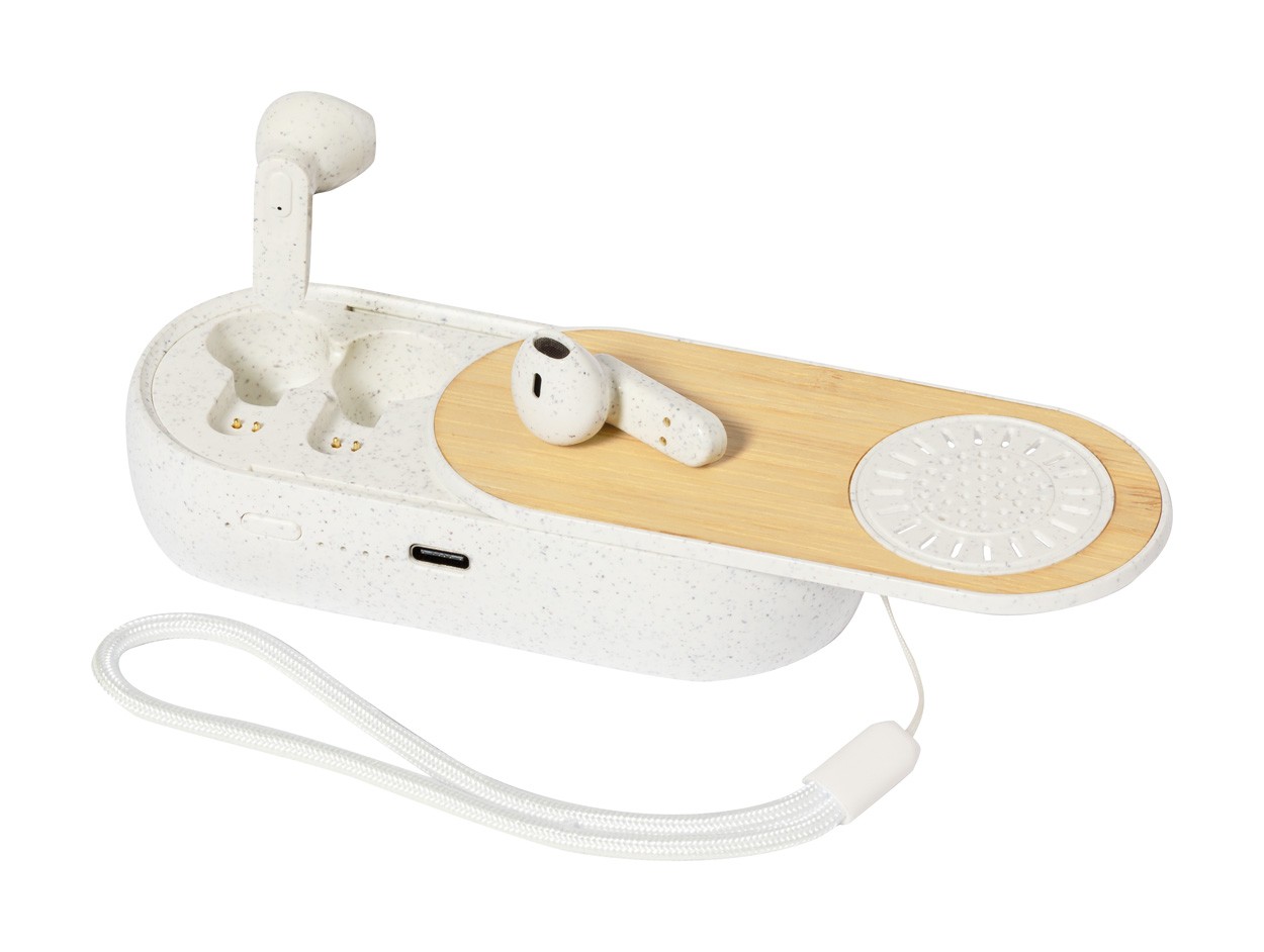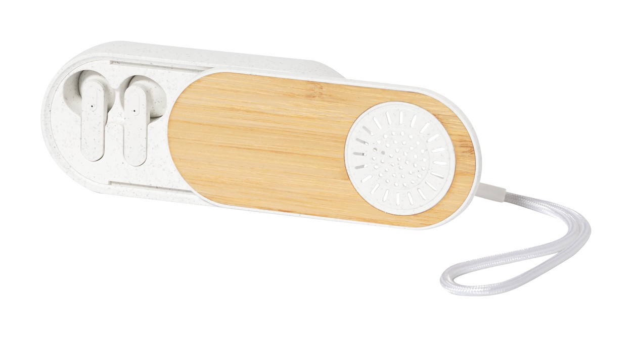 Căști bluetooth fără fir, din plastic ecologic din paie de grâu, în carcasă de încărcător din plastic, multifuncțional, din paie de grâu și bambus cu difuzor încorporat. Cu funcție de apel hands-free și baterie reîncărcabilă încorporată. Inclusiv cablu de încărcare USB.