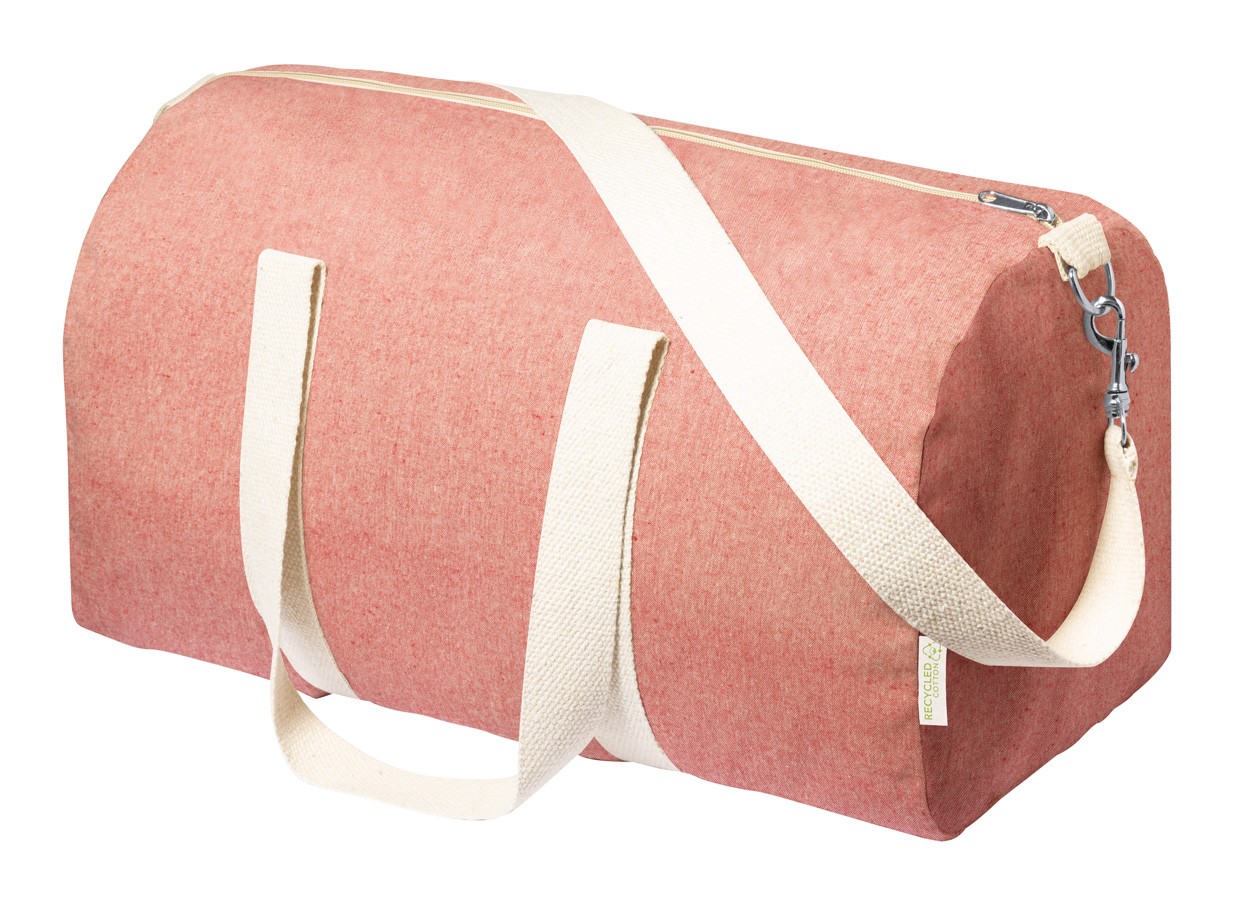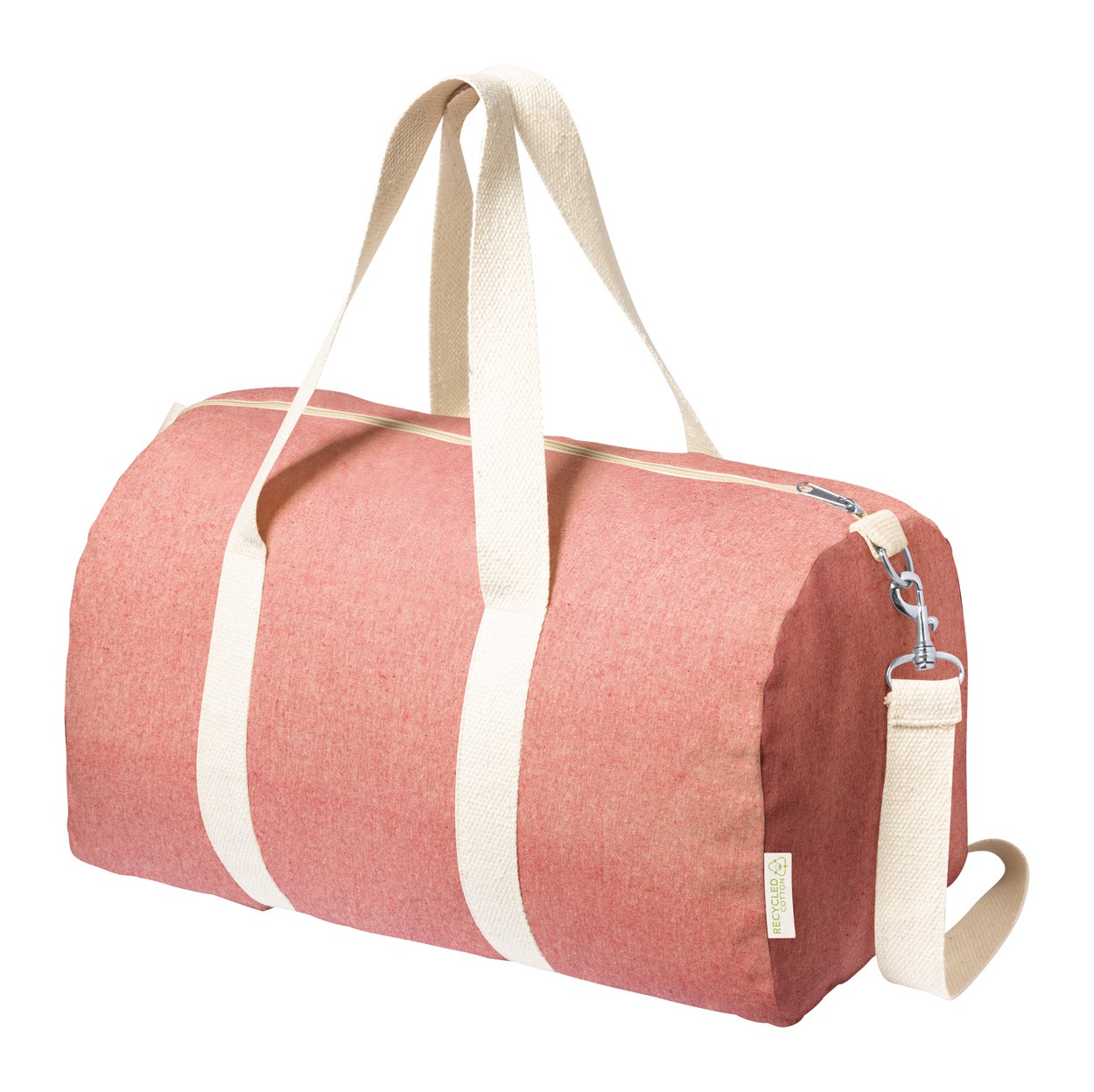 Geantă sport, din bumbac reciclat, cu compartiment cu fermoar, mânere contrastante și curea de umăr reglabilă. Cu etichetă distinctivă din bumbac reciclat. 100% bumbac reciclat, 275 g/m².
