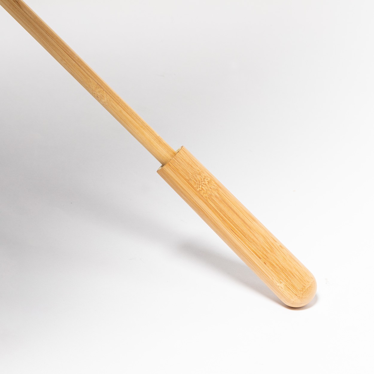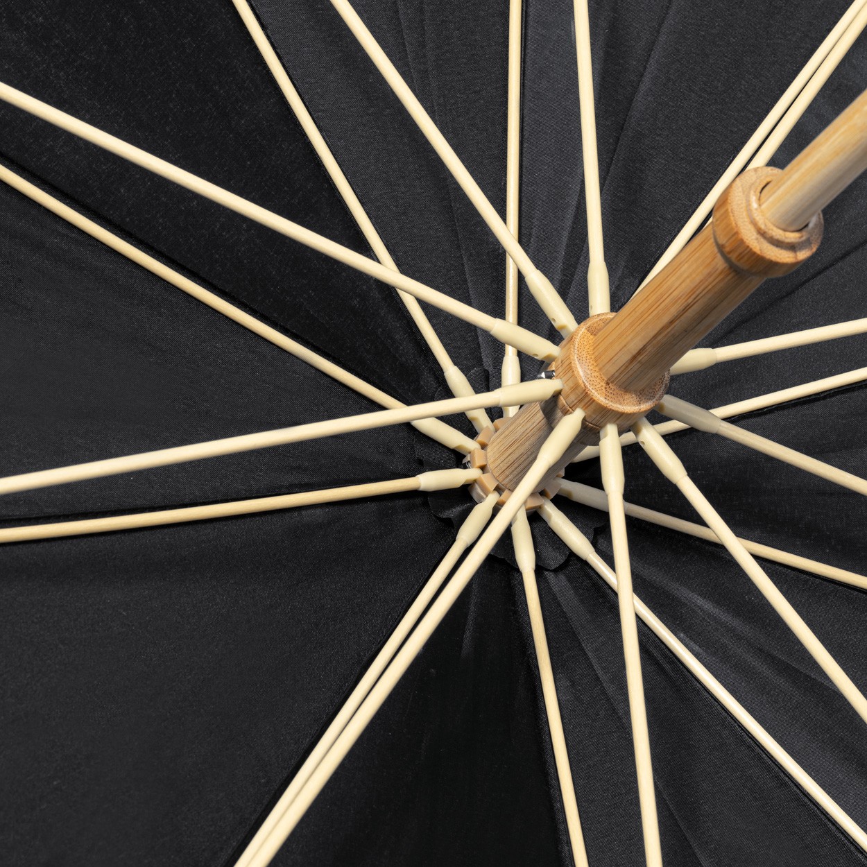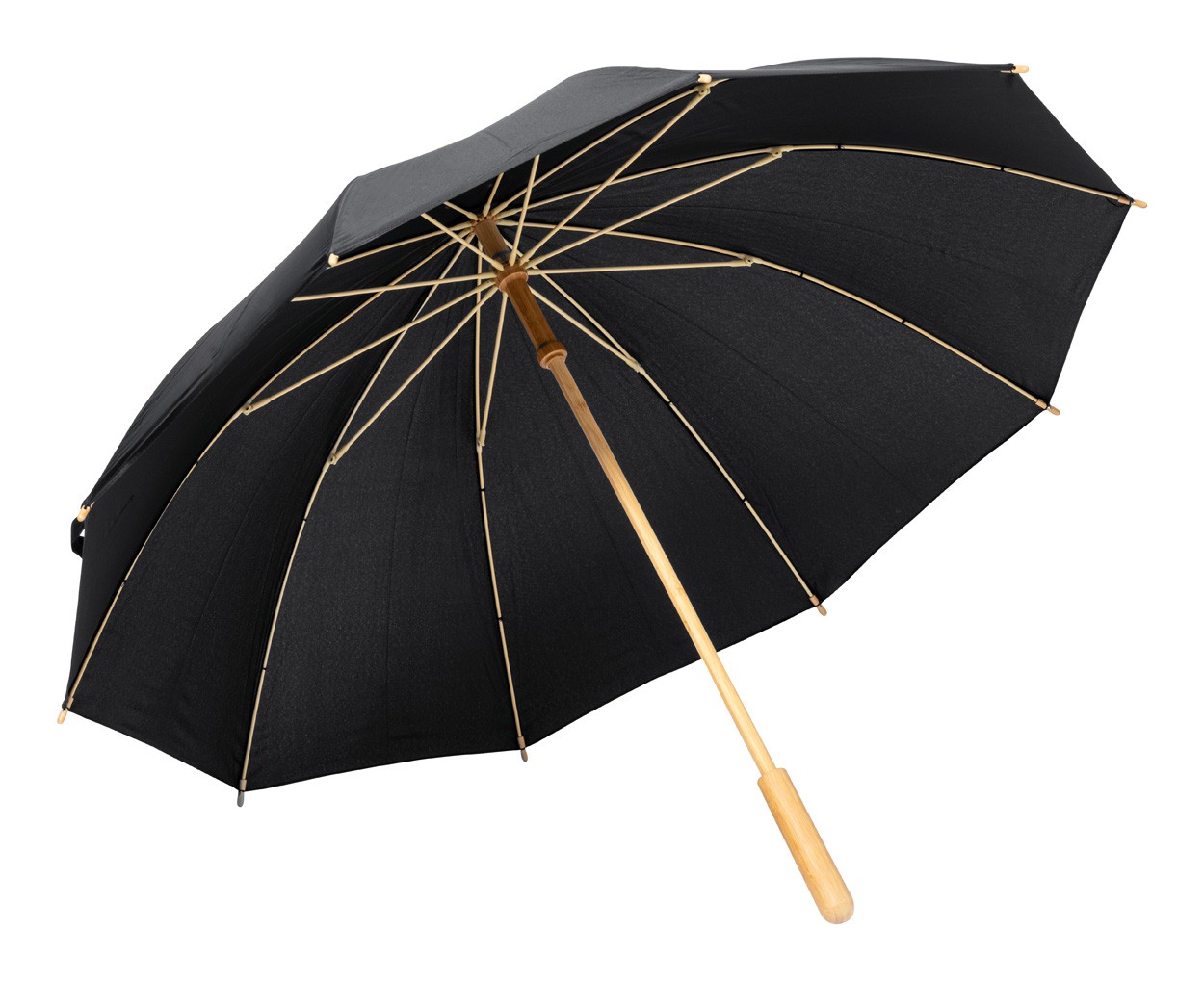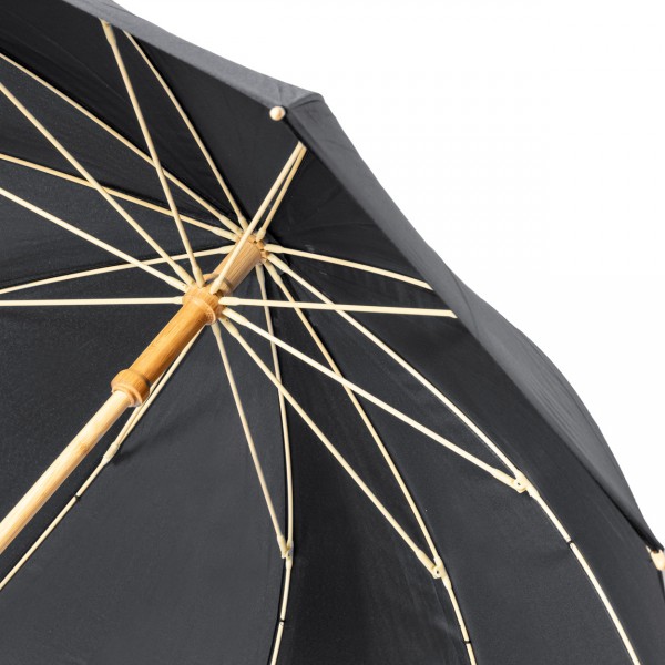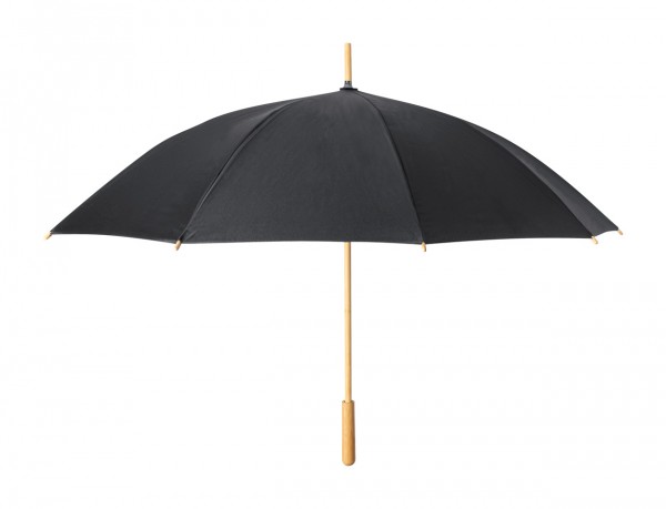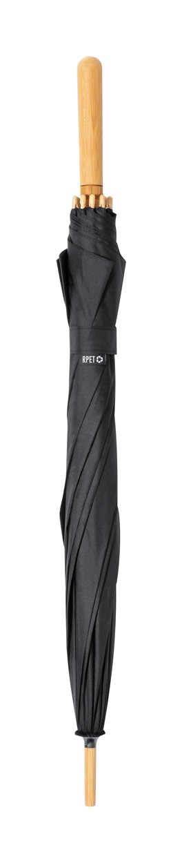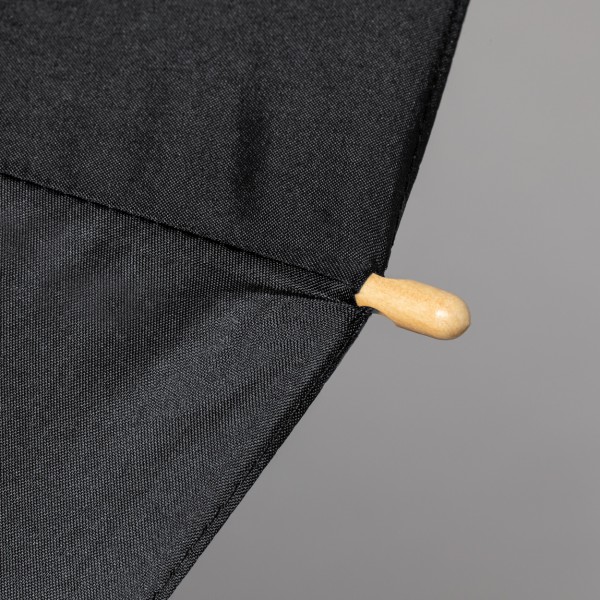 Manual, windproof umbrella in 190T RPET pongee, with fiberglass ribs, velcro closure and bamboo handle.