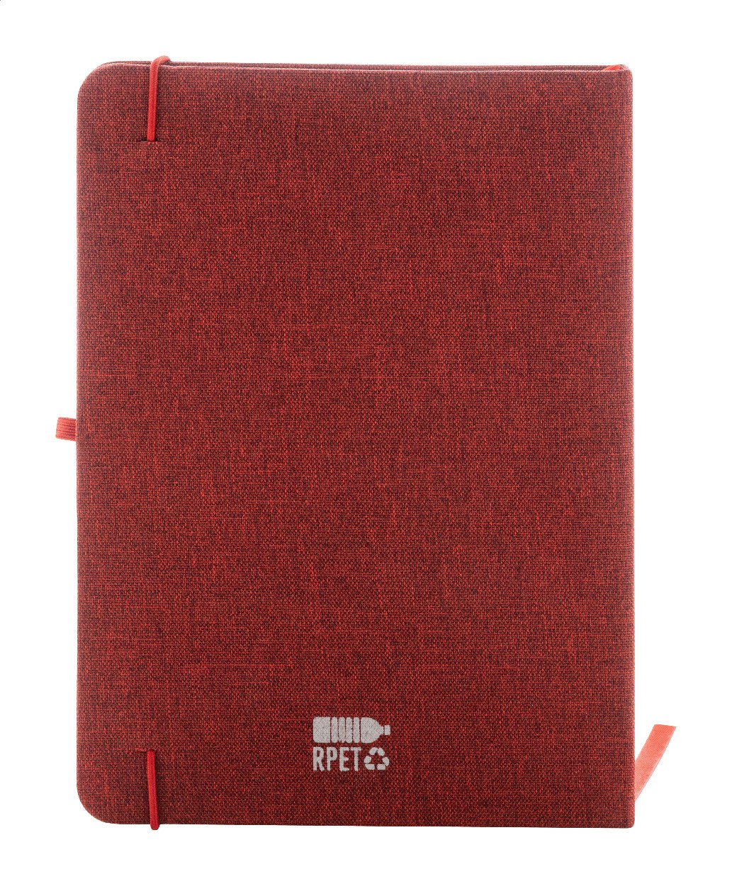 Caiet cu coperta din poliester 300D RPET, cu 80 de foi veline. Cu curea de cauciuc de culoare similară, marcaj și suport pentru pix. Dimensiune A5.