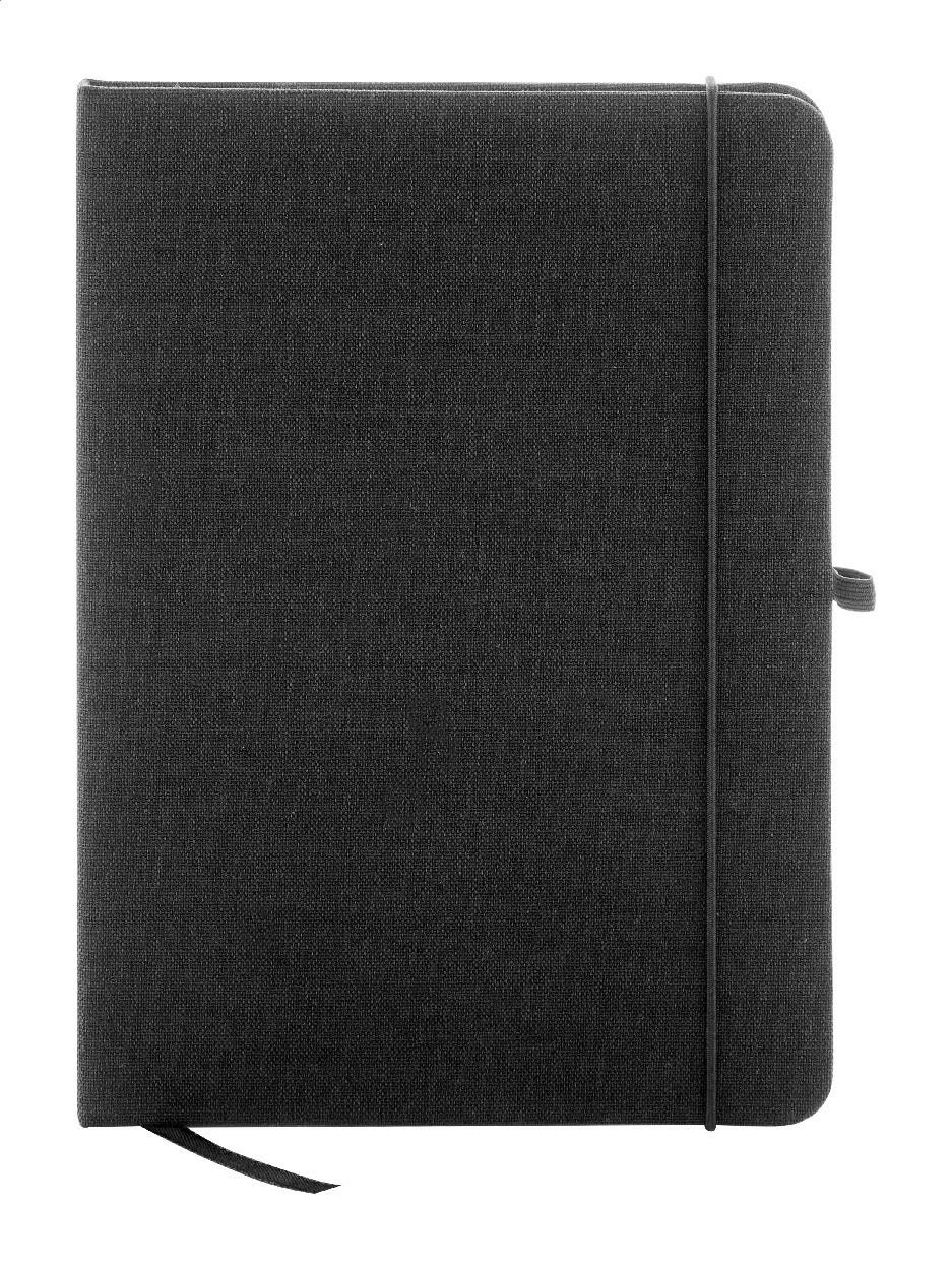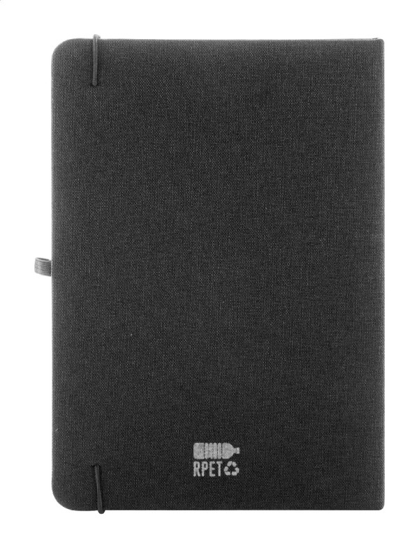 Caiet cu coperta din poliester 300D RPET, cu 80 de foi veline. Cu curea de cauciuc de culoare similară, marcaj și suport pentru pix. Dimensiune A5.