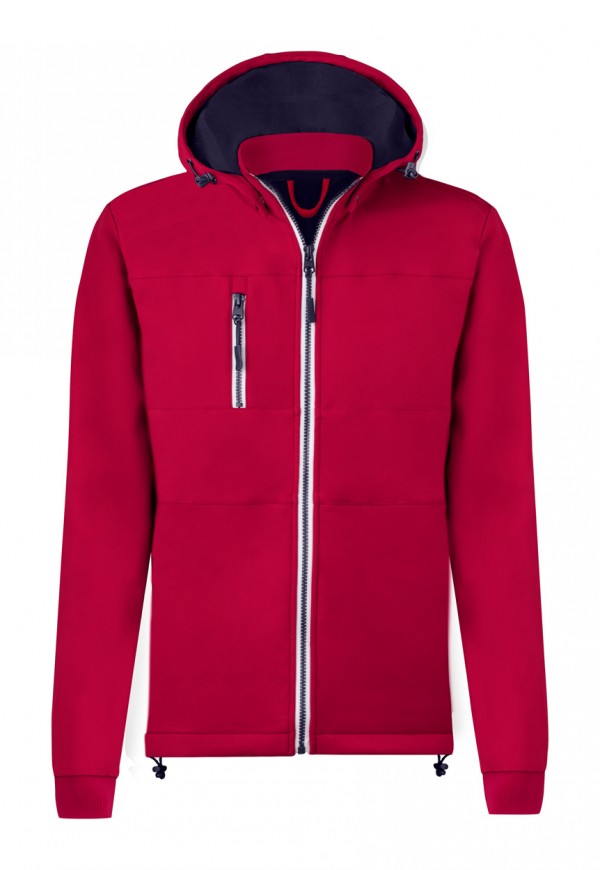 Jachetă softshell, rezistentă la vânt și impermeabilă, cu fermoar, cu 2 buzunare laterale, 1 buzunar frontal, guler ridicat și glugă detașabilă. 100% poliester, 300 g/m².
