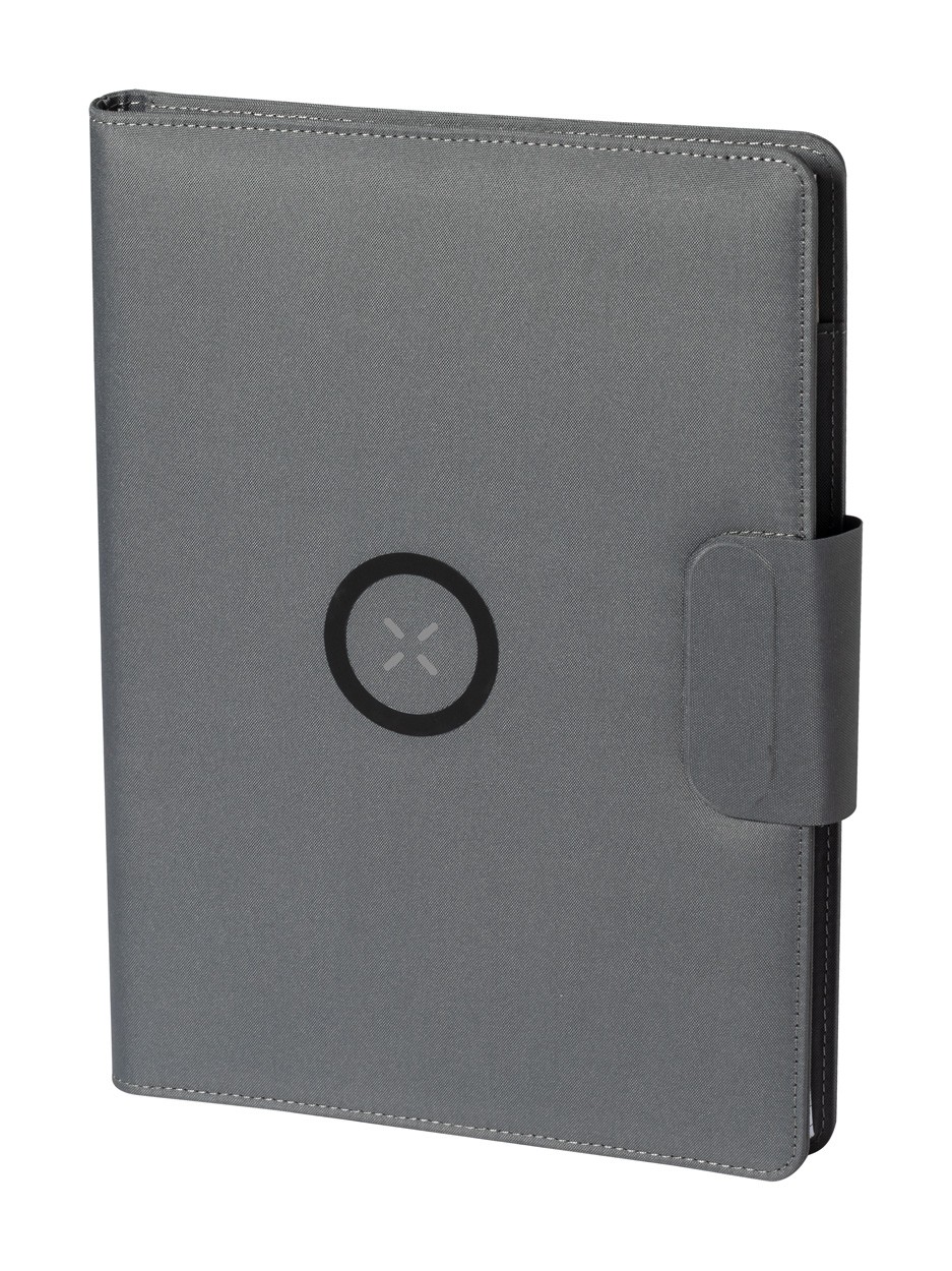Mapă pentru documente, din poliester 300D RPET, dimensiune A4, cu încărcător rapid magnetic fără fir (10W), power bank de 5000 mAh cu port de încărcare USB, suport mobil pliabil și carnet cu 20 de foi dictando. Include inel metalic autoadeziv pentru a utiliza funcția magnetică pe orice dispozitiv încărcat fără fir. Inclusiv cablu de încărcare USB.