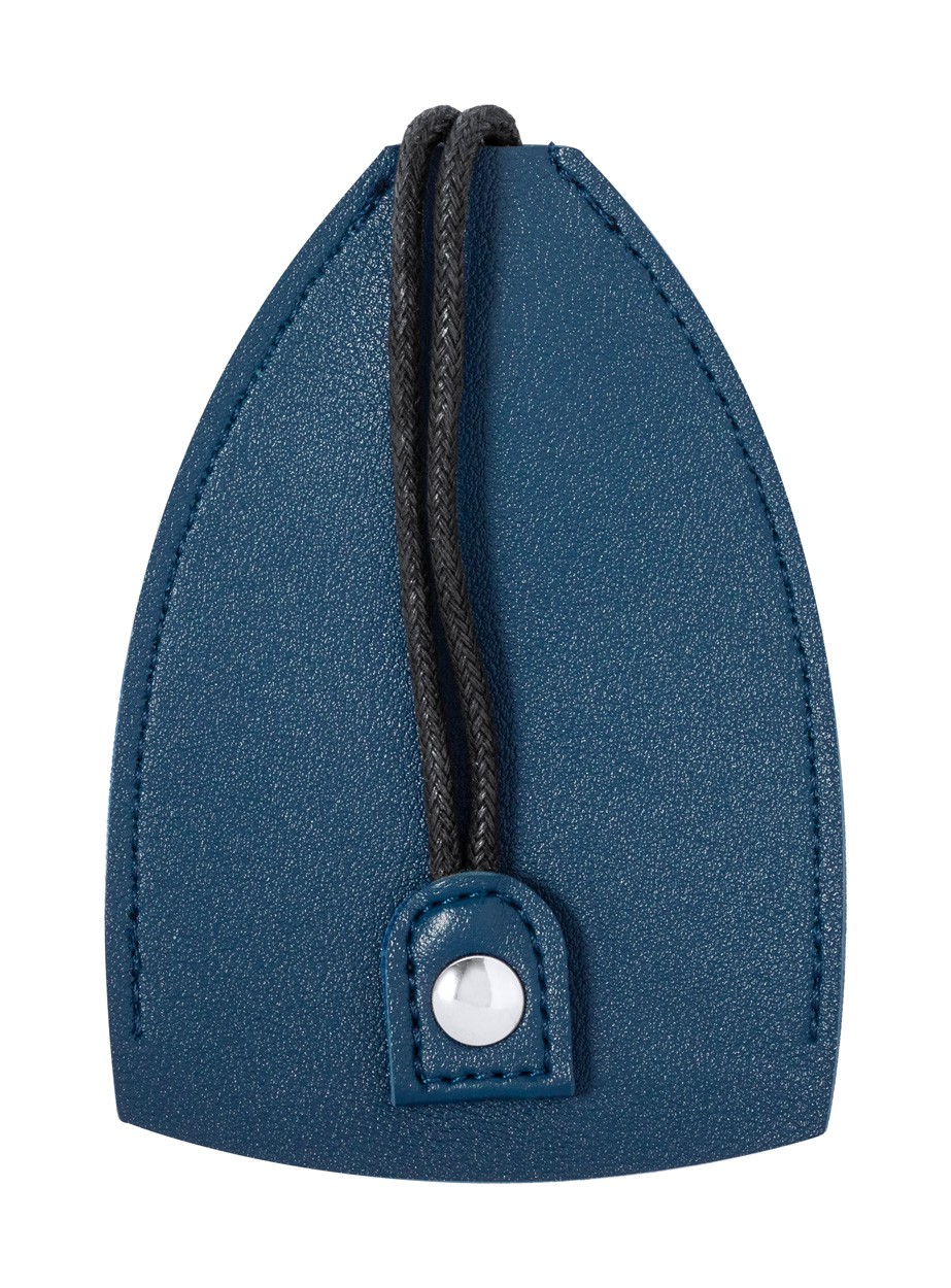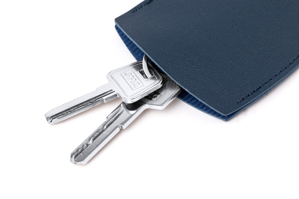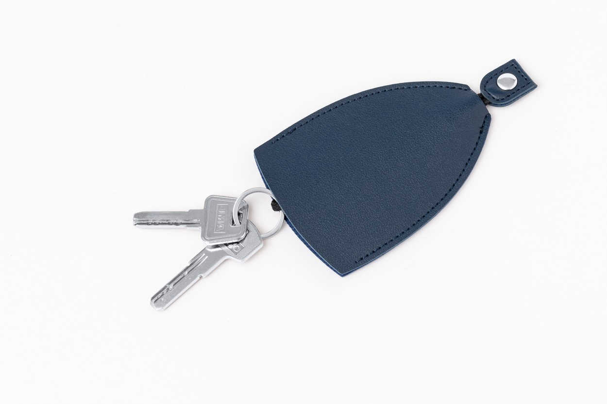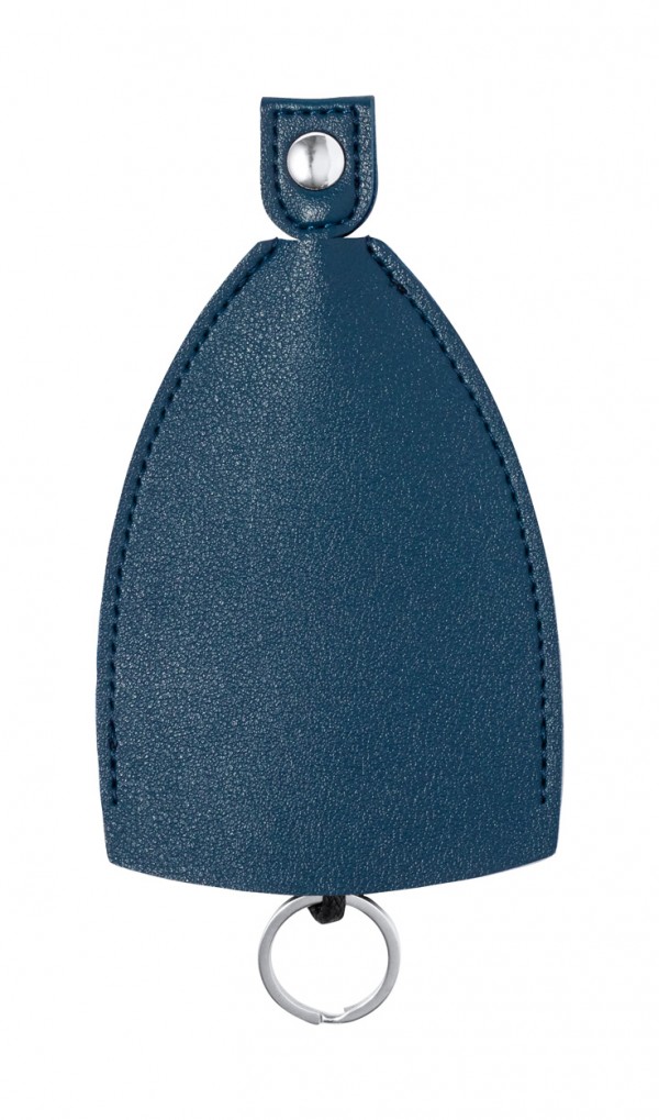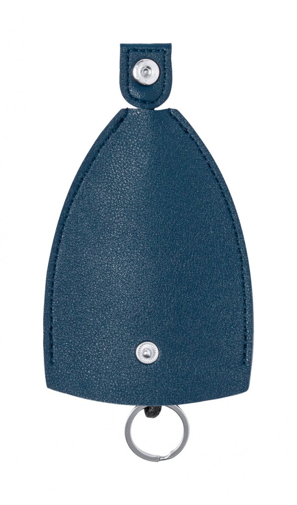 PU leather key pouch with button closure and metal ring.