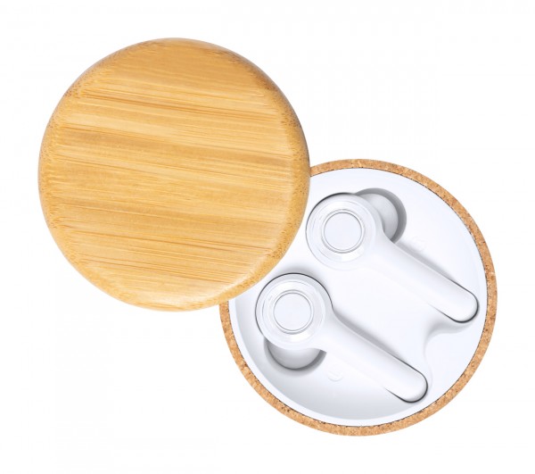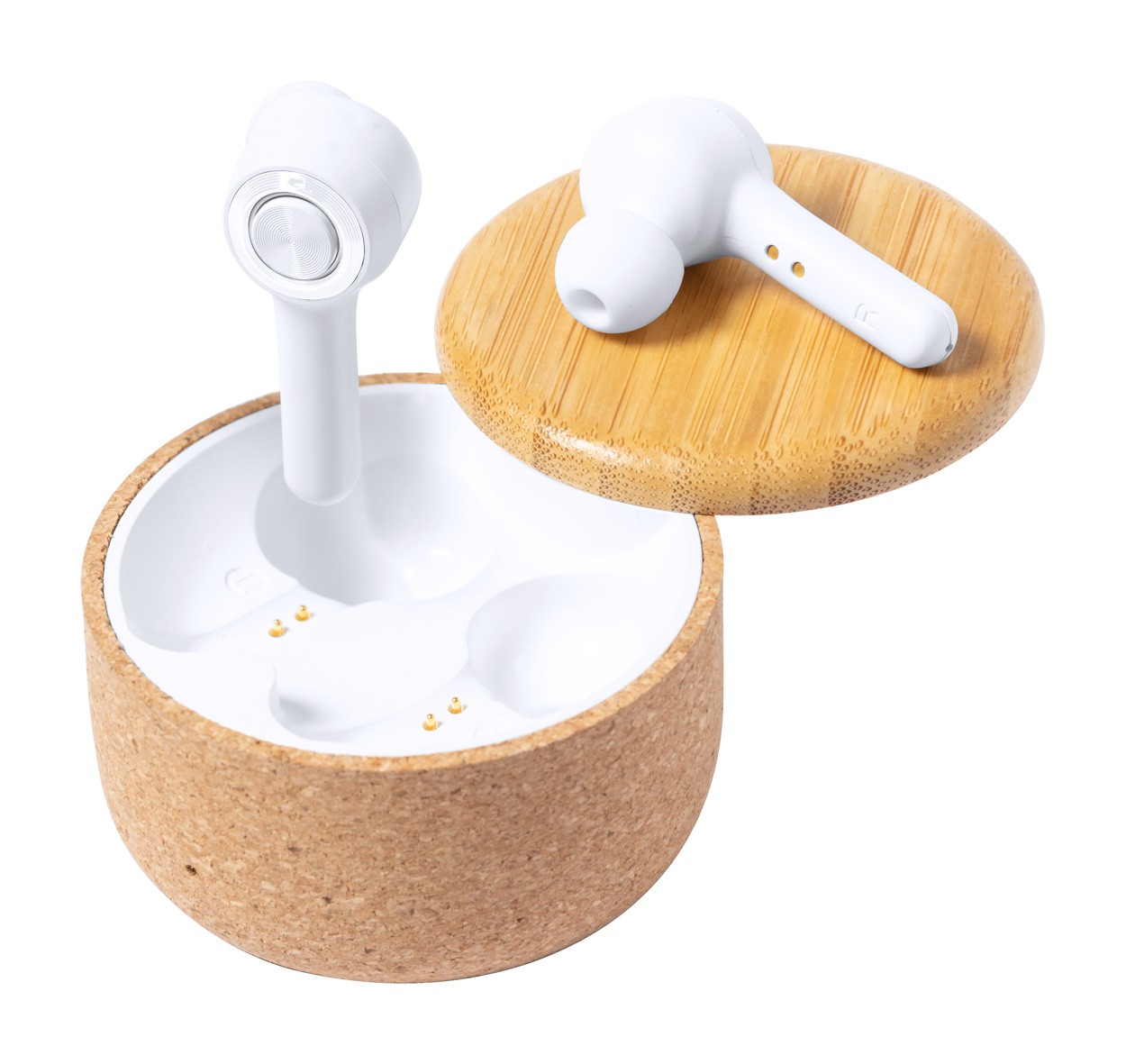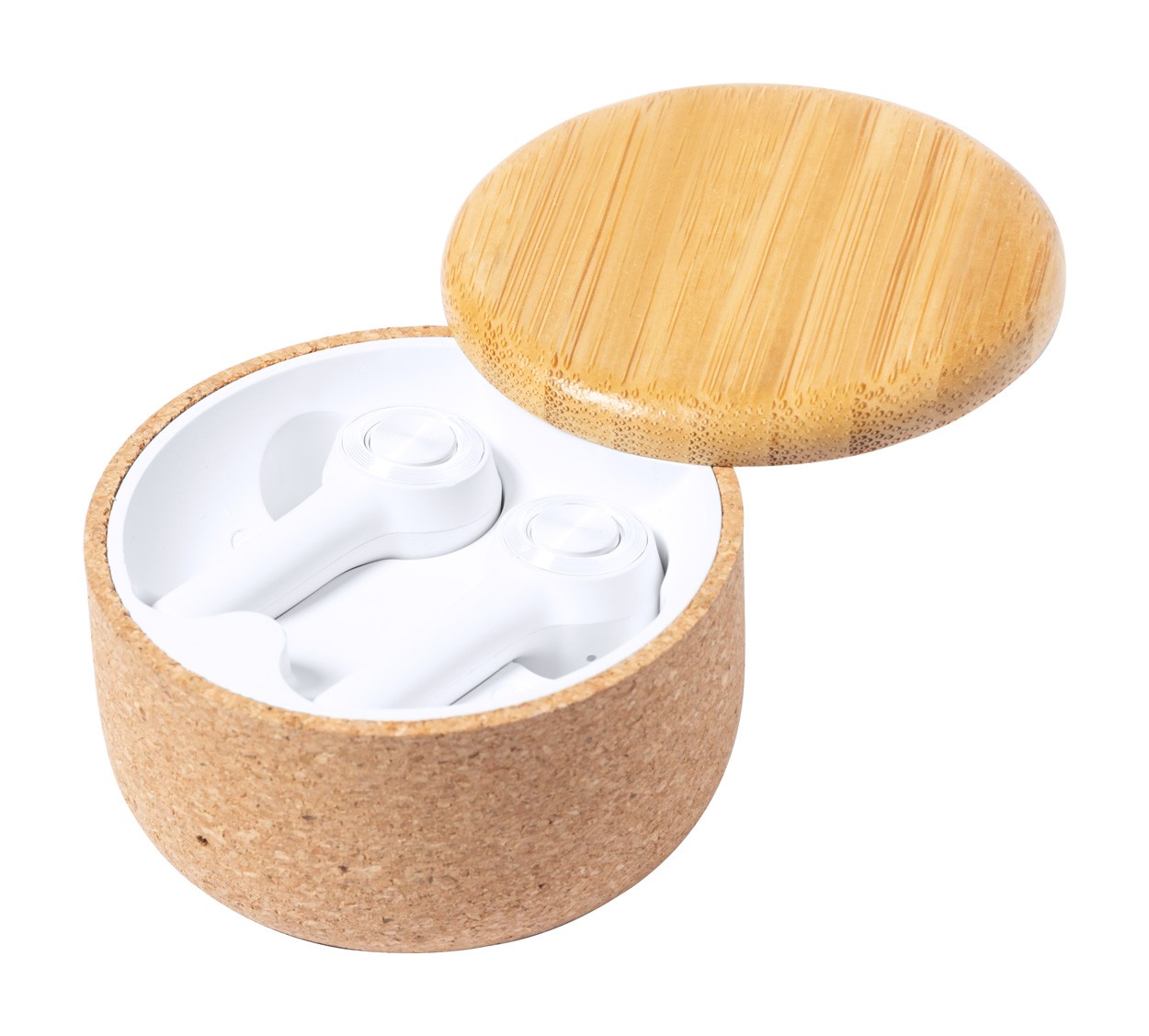 Căști bluetooth, fără fir, cu funcție de apel hands-free. În carcasă pentru încărcător din plută și bambus. Inclusiv cablu de încărcare USB.