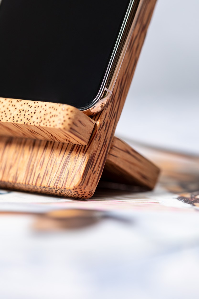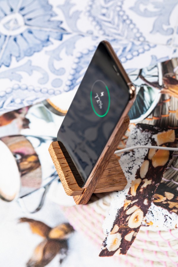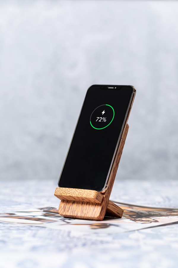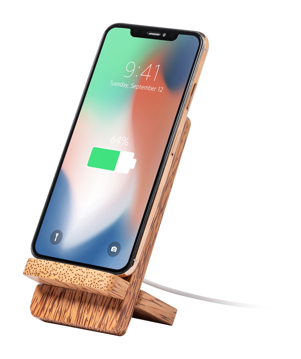 Suport mobil de birou, din nucă de cocos, cu încărcător rapid fără fir încorporat (15W). Inclusiv cablu de încărcare USB. Livrat ambalat plat.