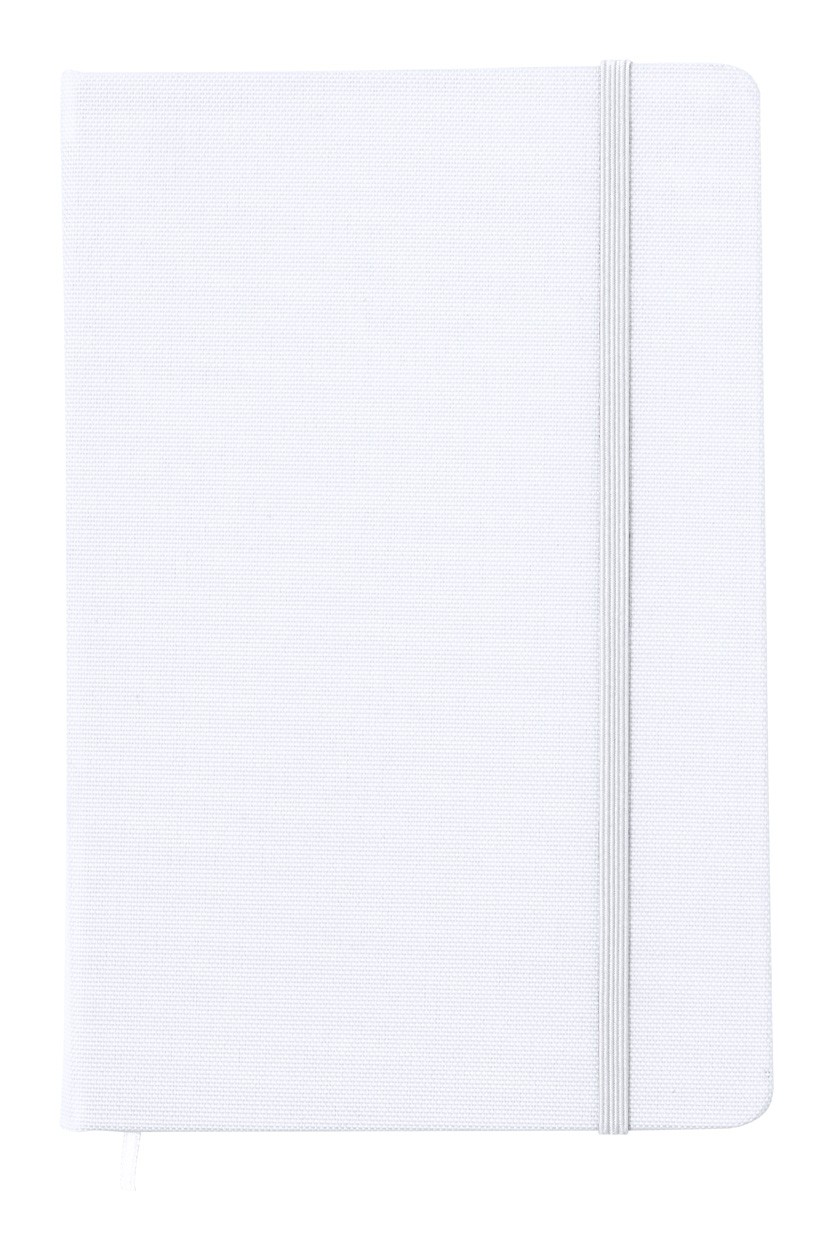 600D RPET polyester covered notebook with 100 blank sheets, coloured rubber band and bookmark. A5 size. Ideal for sublimation printing