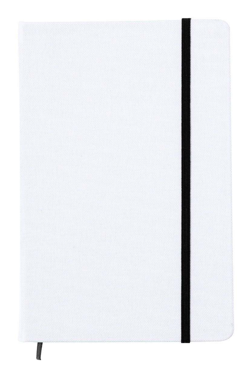 600D RPET polyester covered notebook with 100 blank sheets, coloured rubber band and bookmark. A5 size. Ideal for sublimation printing