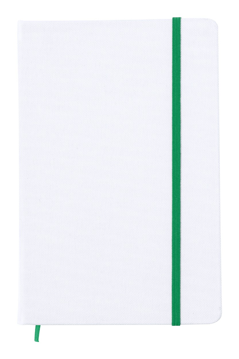 600D RPET polyester covered notebook with 100 blank sheets, coloured rubber band and bookmark. A5 size. Ideal for sublimation printing