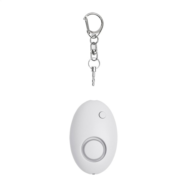 Breloc metalic tip carabină, cu alarmă personală și lanternă cu 1 LED, din ABS reciclat. Alarma se activează atunci când se trage de știft. Volumul alarmei: aprox. 100 dB. Cu baterii tip pastilă.