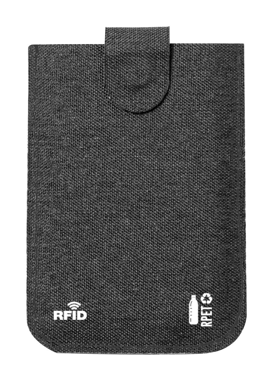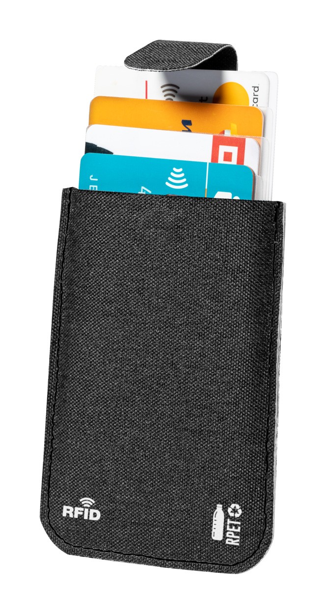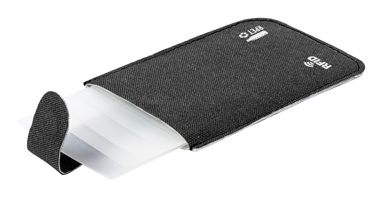 Suport card de credit RPET, cu blocare RFID, din poliester, cu 1 compartiment pentru 5 carduri.