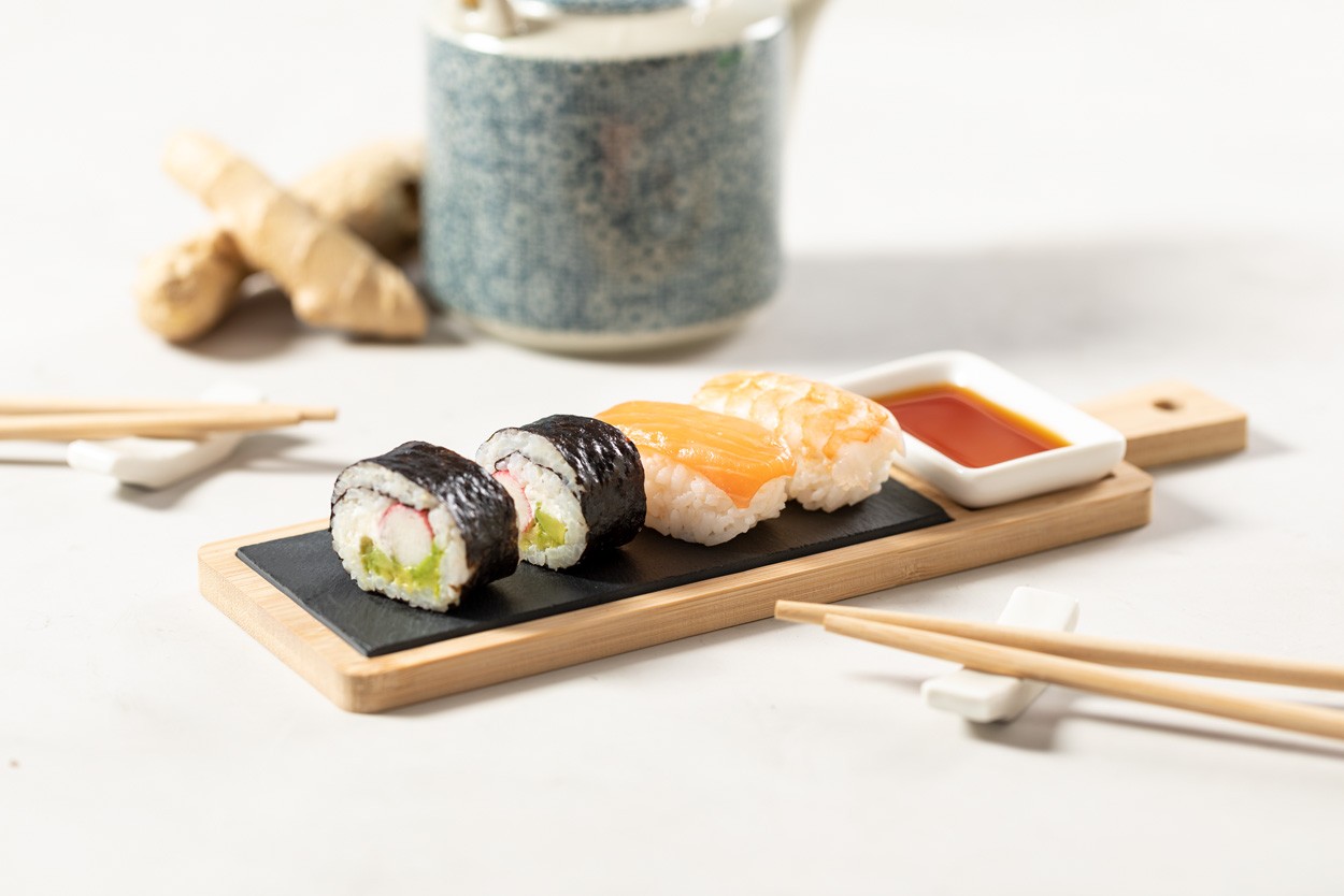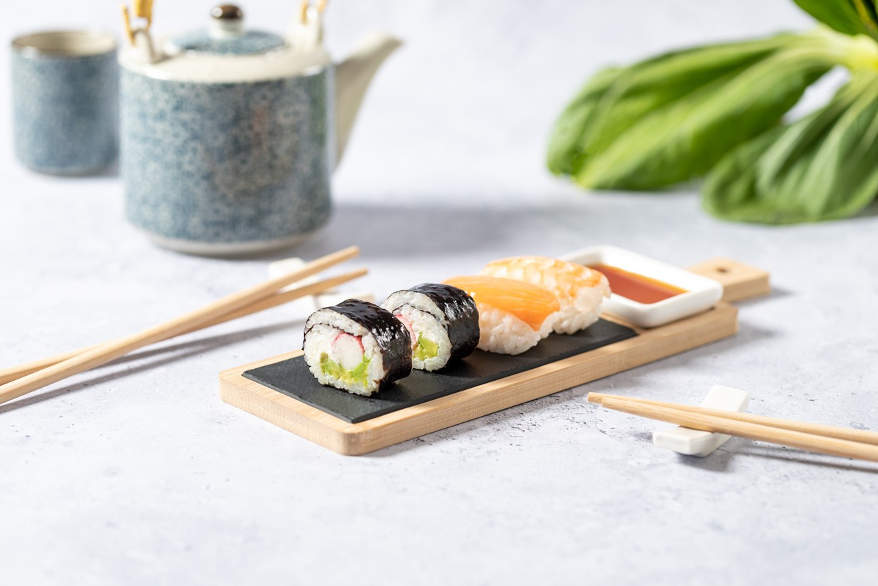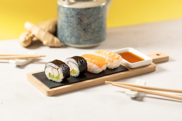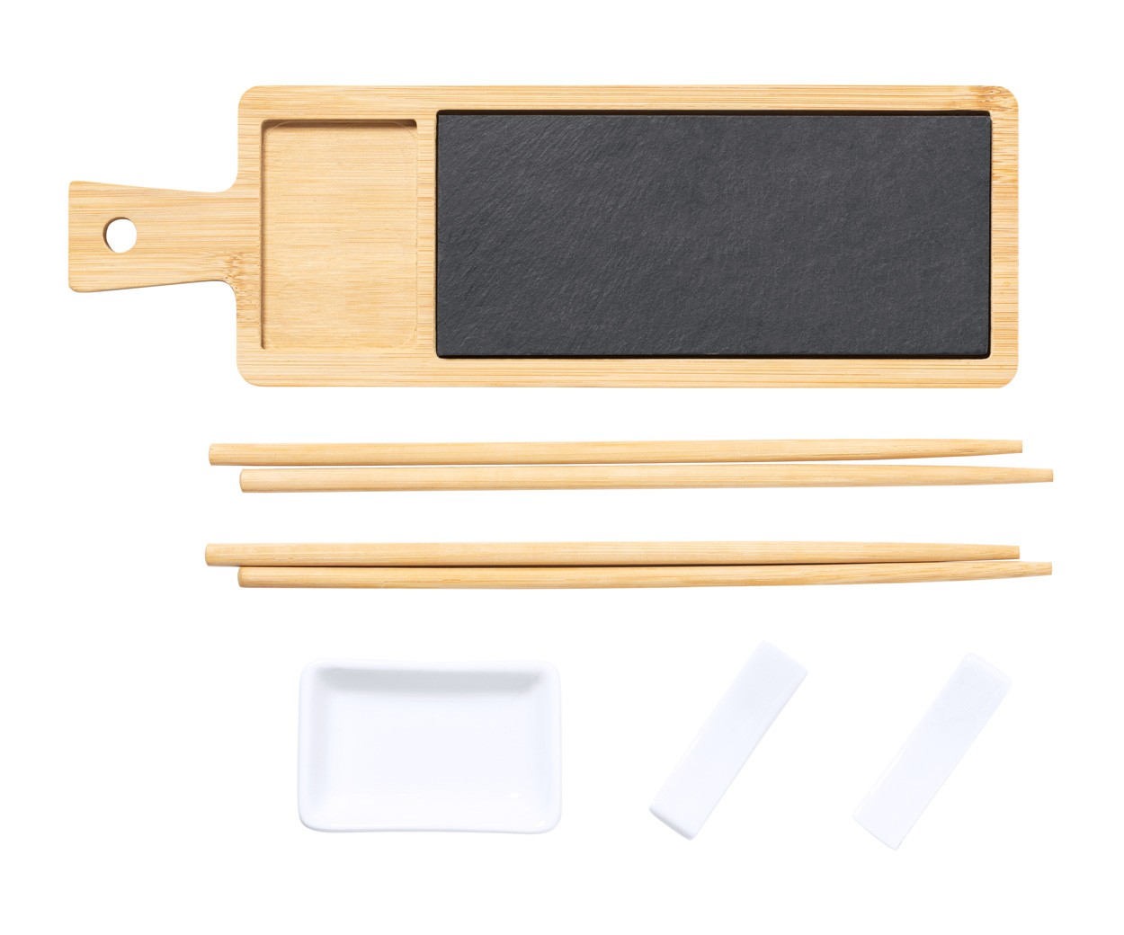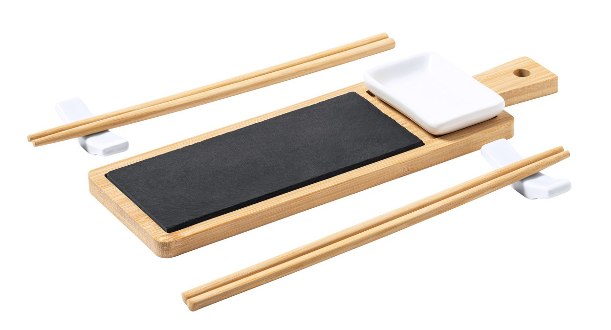 Set pentru servire sushi, din bambus, 6 buc. Include 2 perechi de bețișoare din bambus cu suporturi pentru bețișoare din ceramică, vas de sos din ceramică și tablă de servire din bambus cu inserție de ardezie. În cutie de hârtie kraft.