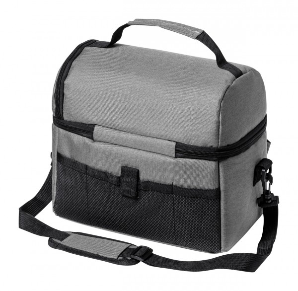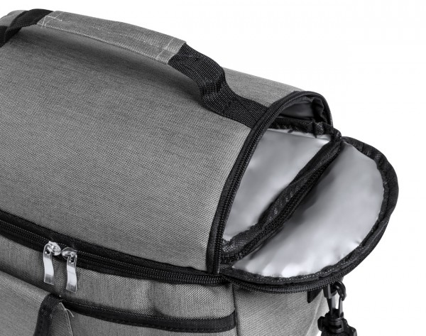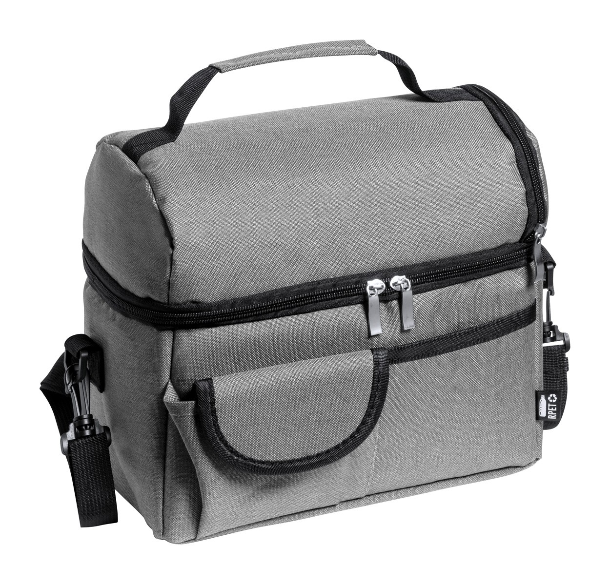 Geantă frigorifică, RPET, cu căptușeală PEVA, compartimente cu fermoar, buzunare frontale, mâner și curea de umăr reglabilă. Cu etichetă distinctivă RPET. Poliester 600D RPET.