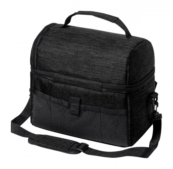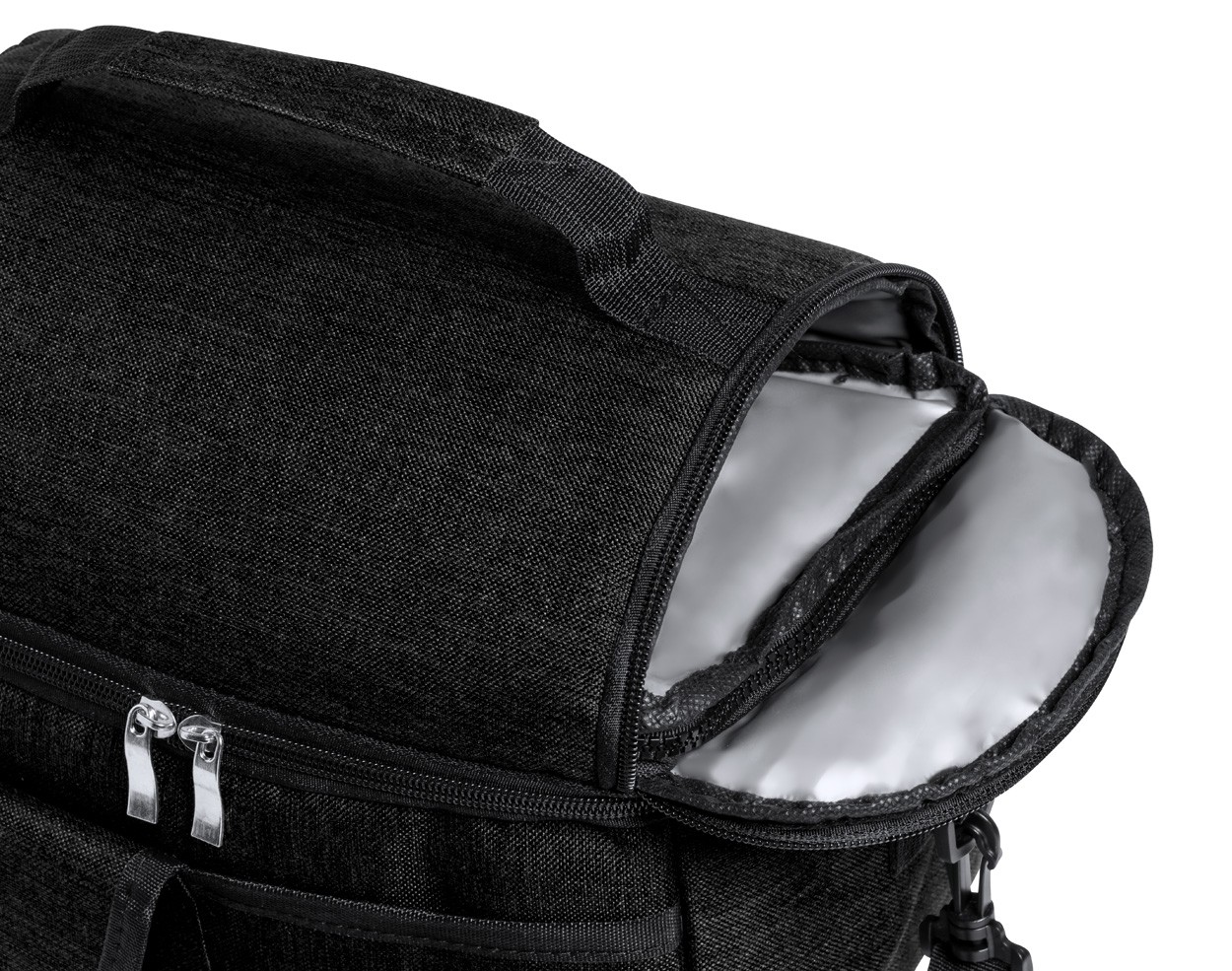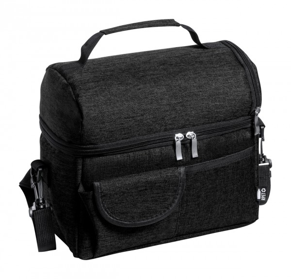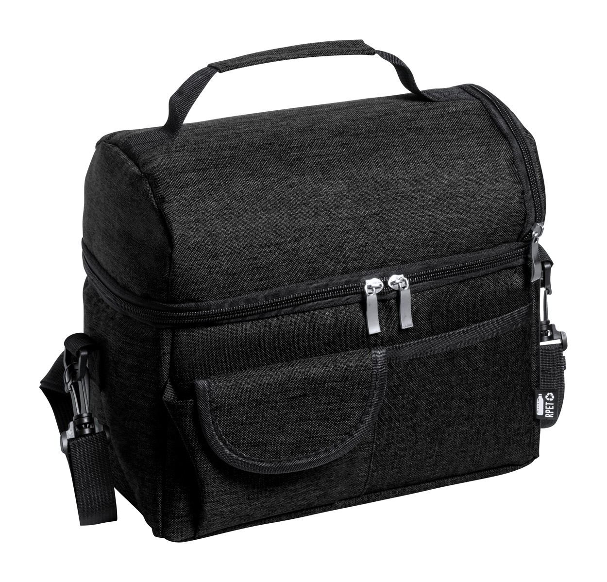 Geantă frigorifică, RPET, cu căptușeală PEVA, compartimente cu fermoar, buzunare frontale, mâner și curea de umăr reglabilă. Cu etichetă distinctivă RPET. Poliester 600D RPET.