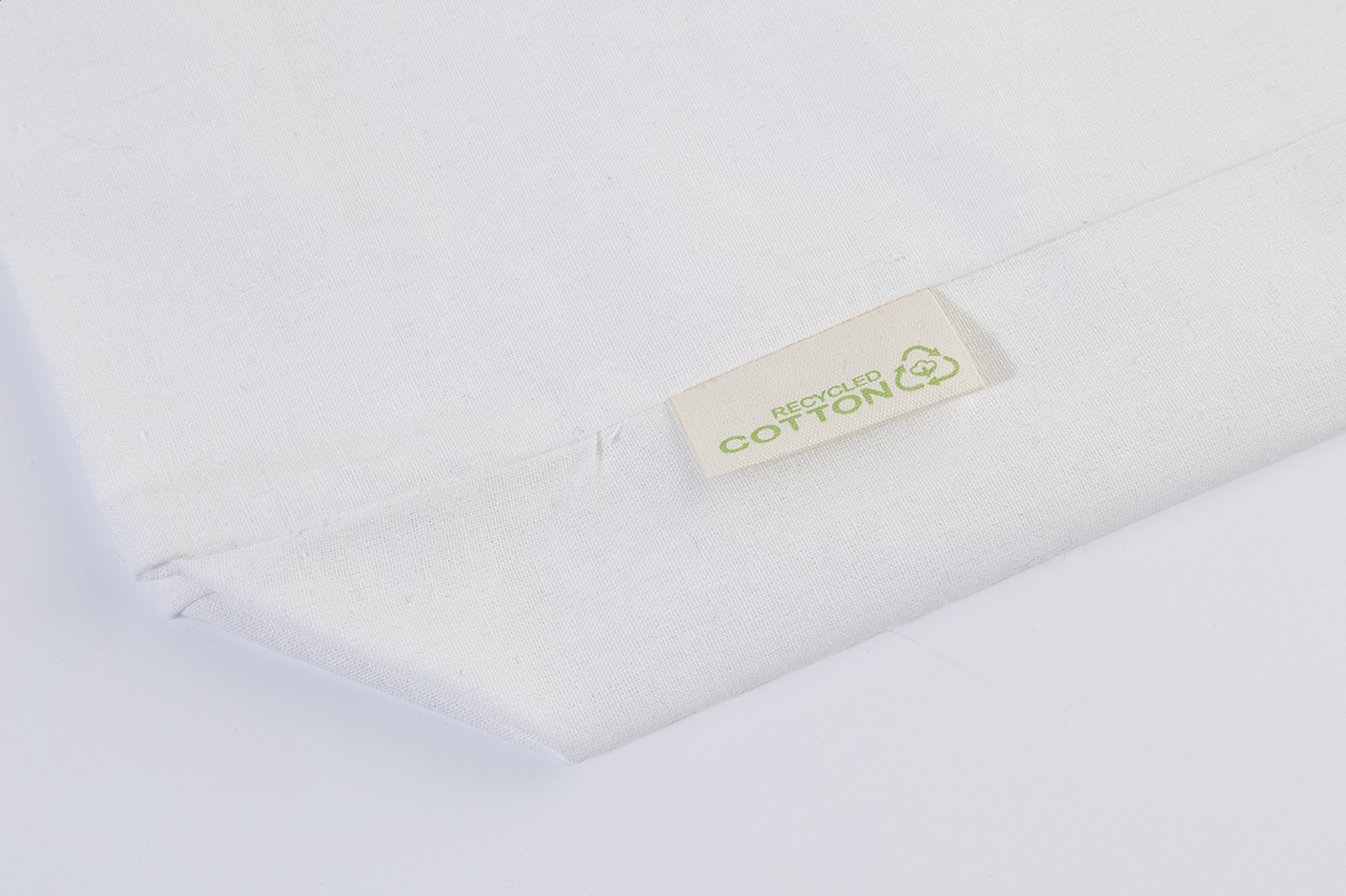 Sacoșă de cumpărături, cu pliu și mânere lungi, din 70% bumbac reciclat și 30% poliester RPET, 140 g/m². Cu etichetă distinctivă din bumbac reciclat.