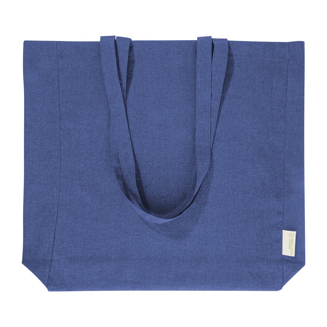 Sacoșă de cumpărături, cu pliu și mânere lungi, din 70% bumbac reciclat și 30% poliester RPET, 140 g/m². Cu etichetă distinctivă din bumbac reciclat.