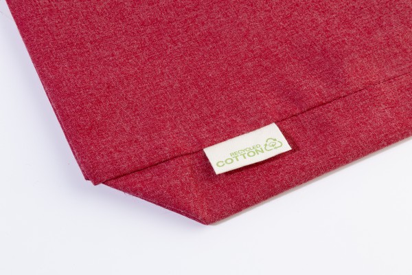 Sacoșă de cumpărături, cu pliu și mânere lungi, din 70% bumbac reciclat și 30% poliester RPET, 140 g/m². Cu etichetă distinctivă din bumbac reciclat.