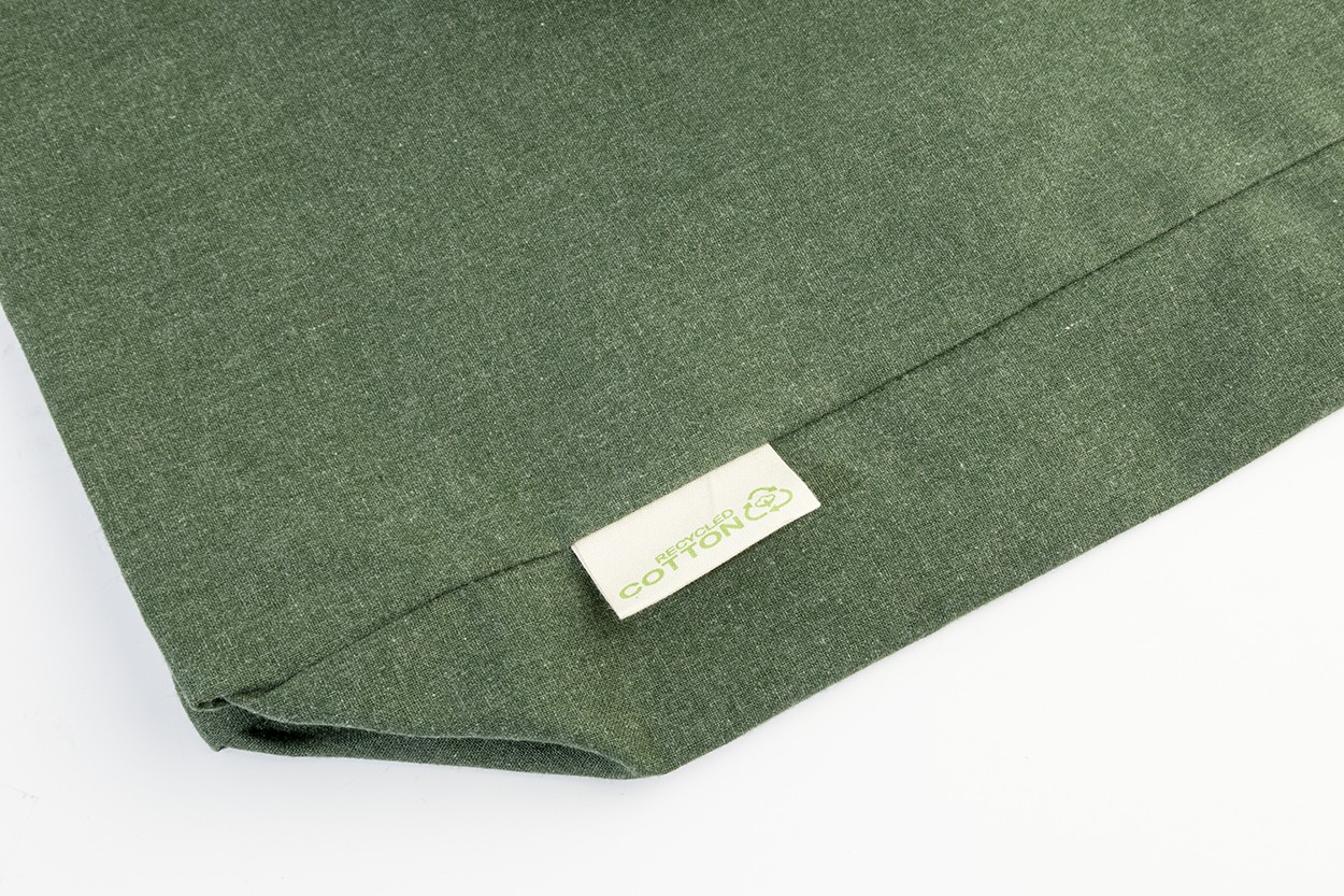 Sacoșă de cumpărături, cu pliu și mânere lungi, din 70% bumbac reciclat și 30% poliester RPET, 140 g/m². Cu etichetă distinctivă din bumbac reciclat.