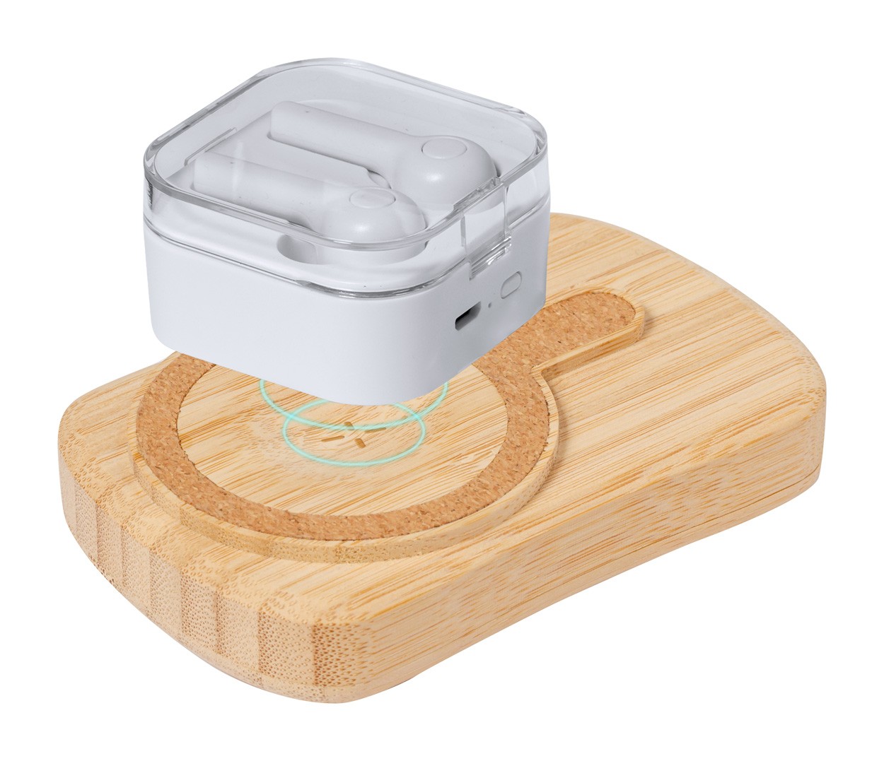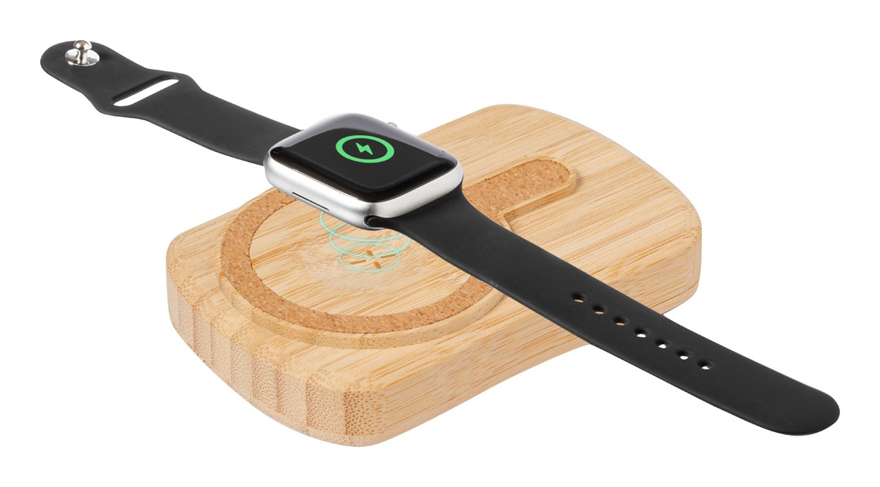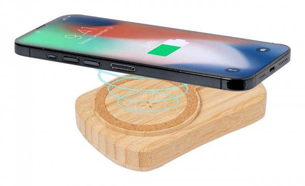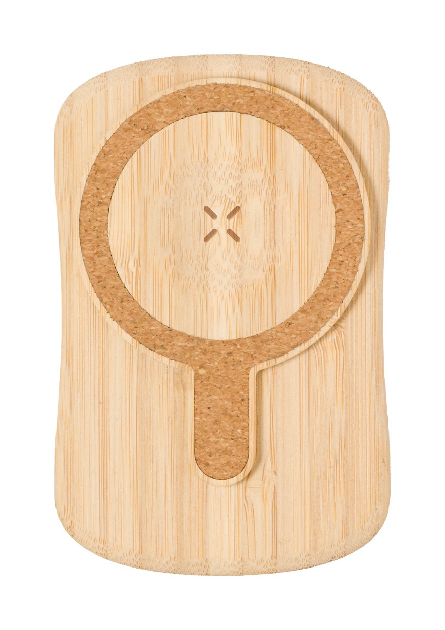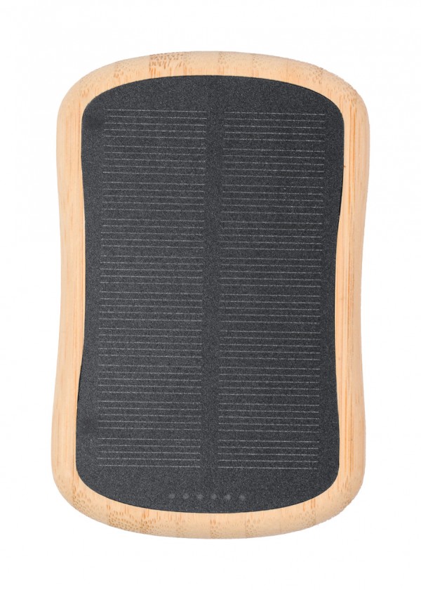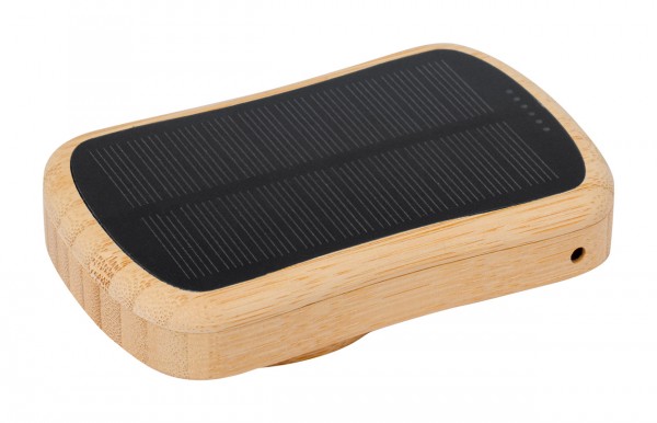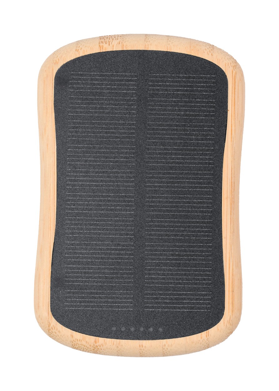 Bamboo USB power bank with built-in magnetic wireless fast charger (15 W), 5000 mAh battery and solar charger. With 1 USB-C charger ports. USB-C input port. Compatible with iPhone® 12 or newer. Including USB charger cable.