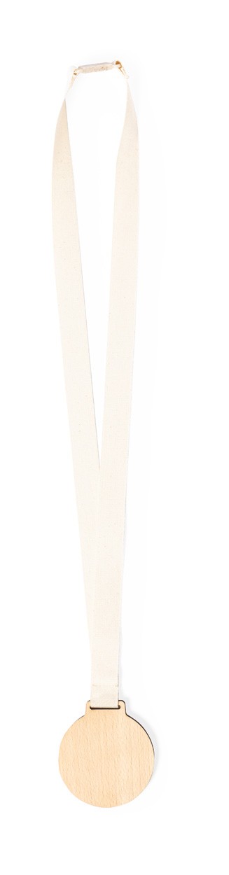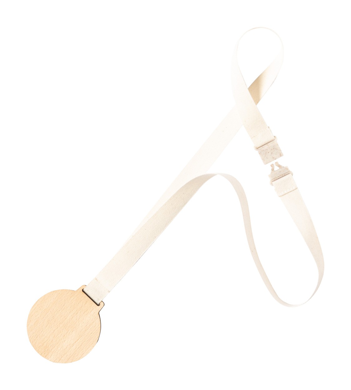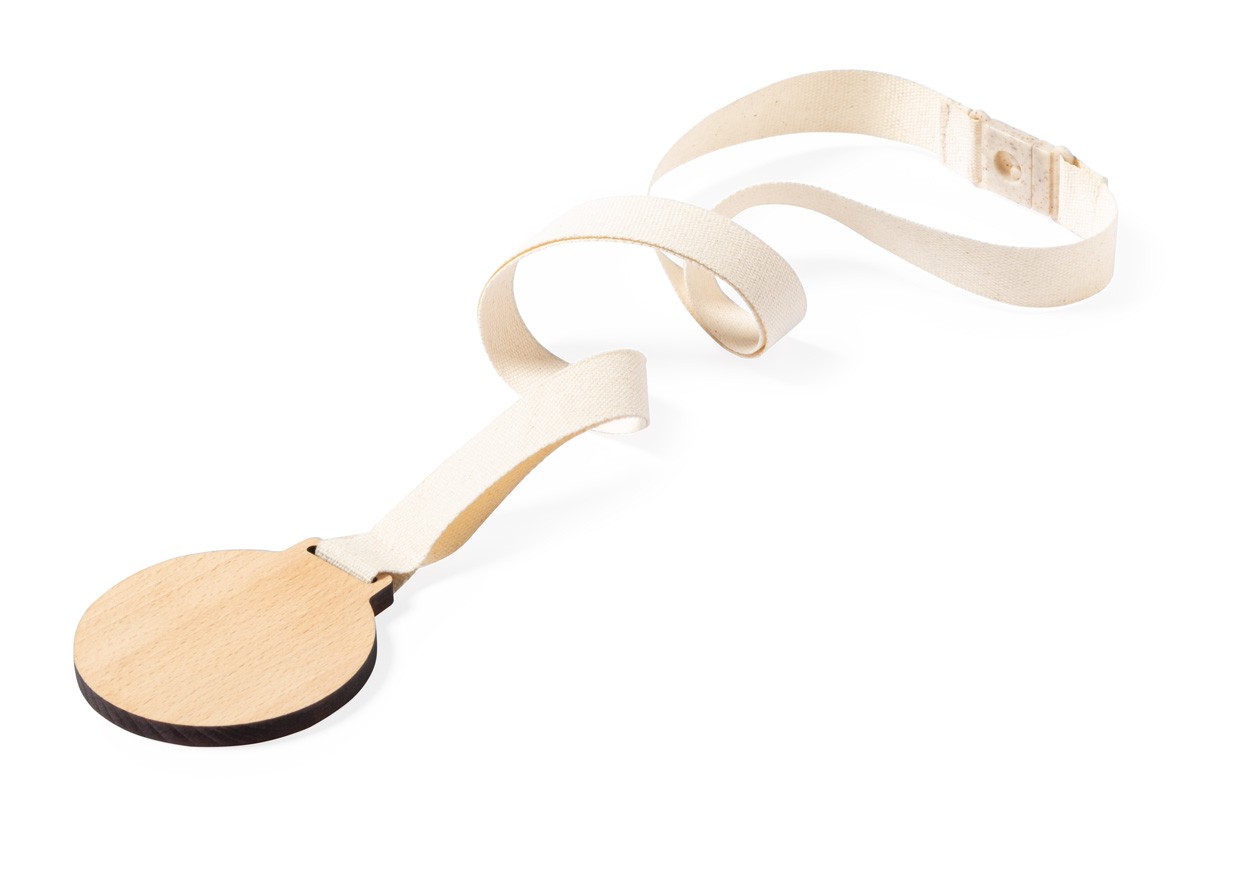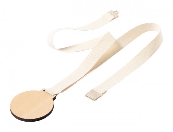 Medalie din lemn pe șnur din bumbac, cu cataramă de siguranță din paie de grâu.