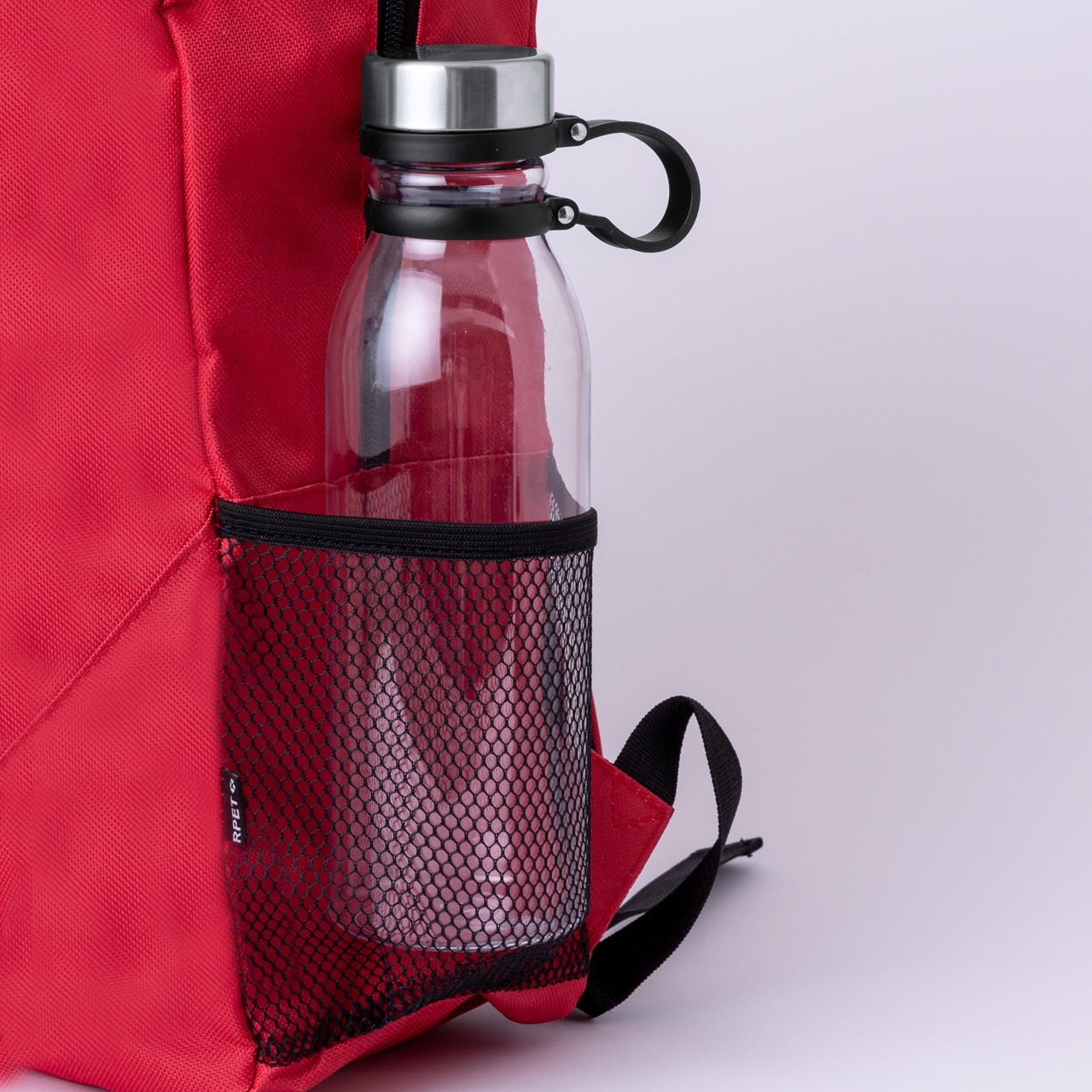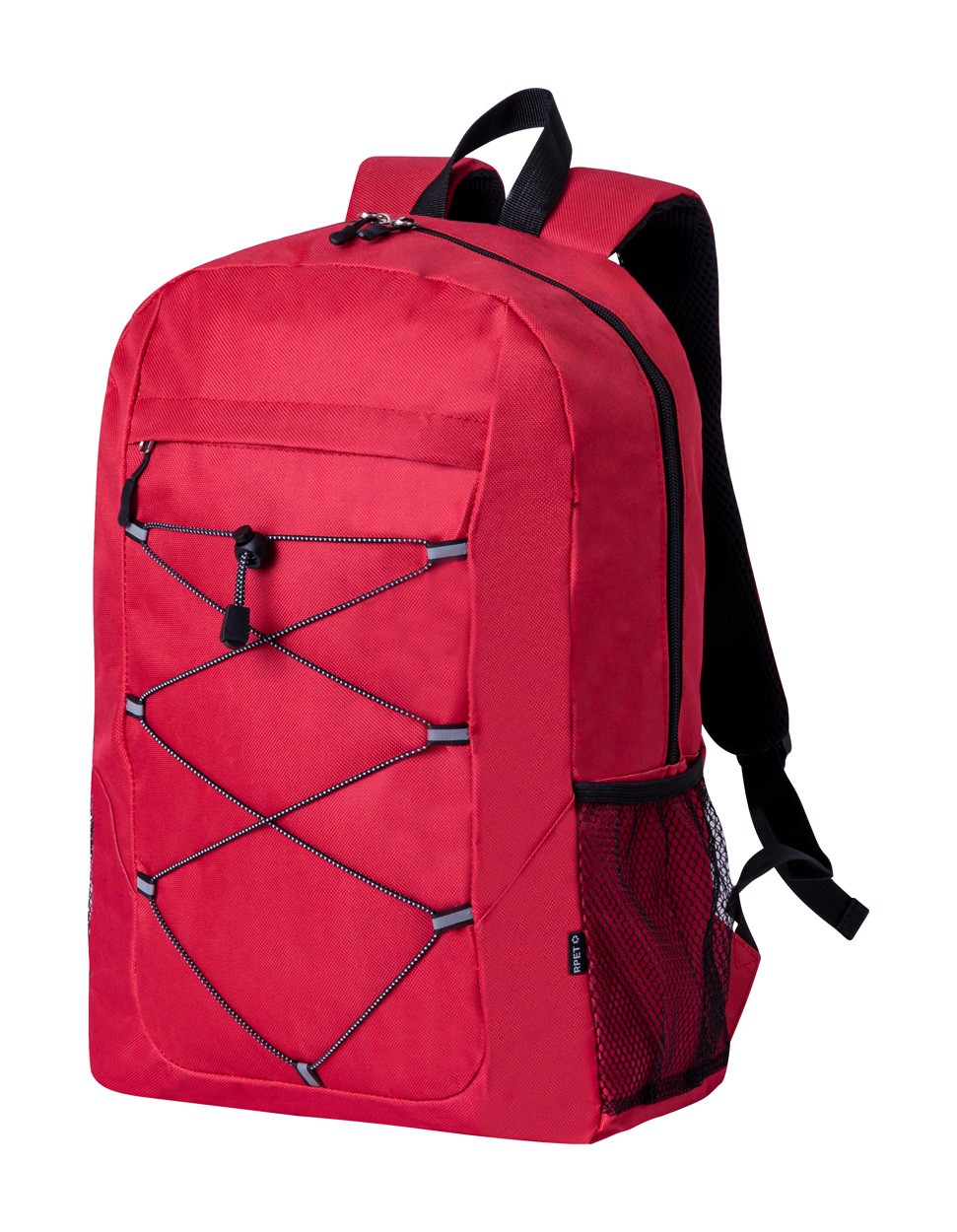 Rucsac RPET, cu compartiment cu fermoar și buzunar frontal, buzunare laterale din plasă, spate și bretele căptușite. Poliester 600D RPET cu etichetă distinctivă RPET.