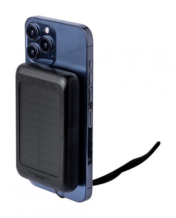 USB power bank with built-in solar charger, 1 LED light with 2 light modes, magnetic wireless fast charger (5W) and 5000 mAh battery. visible electronic components, built-in magnetic wireless fast charger (15 W) and 5000 mAh battery. With 1 USB and 1 USB-C charger ports. USB and USB-C input port. Compatible with iPhone® 12 or newer. Including USB charger cable.