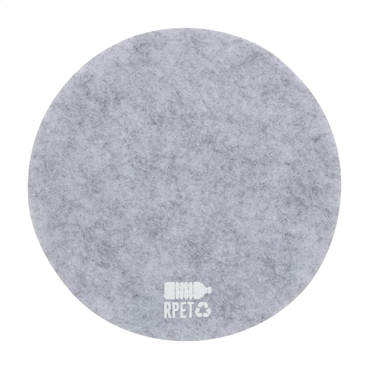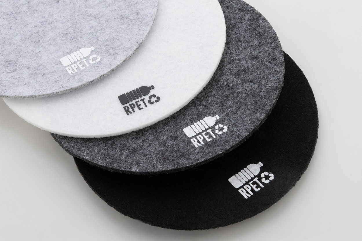 Coaster rotund, din fetru RPET. Cu semn distinctiv RPET.