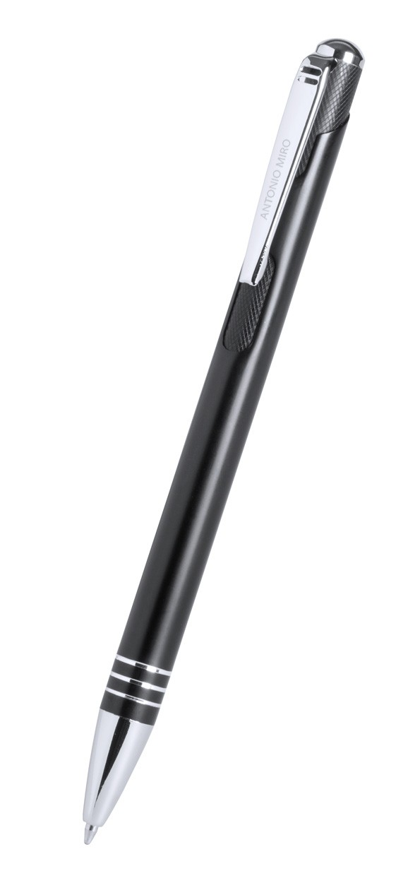 Pix din aluminiu cu mină albastră, în etui din plastic negru. Marca Antonio Miro.