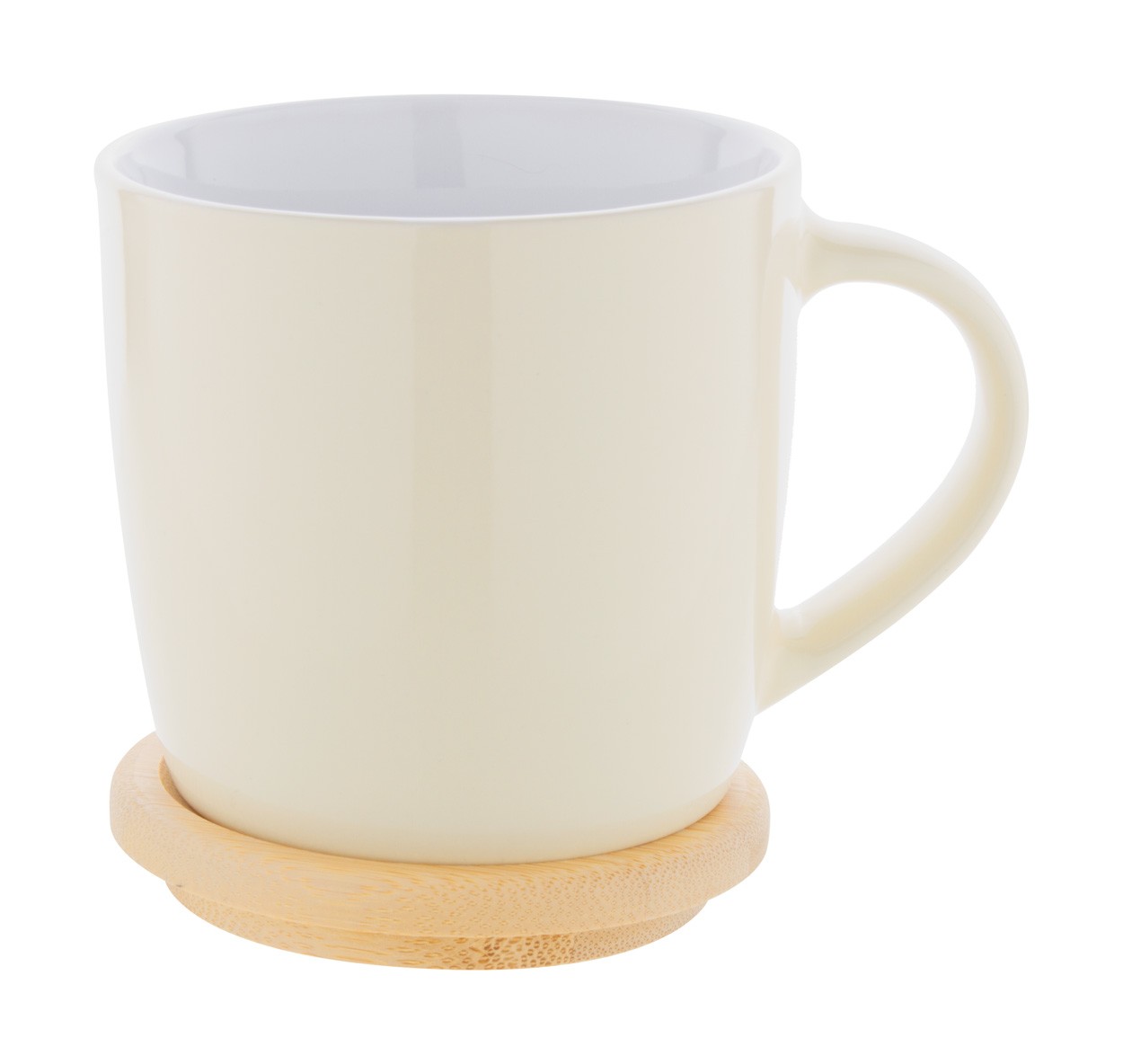 Cană din ceramică colorată, de inaltă calitate, cu interior alb și coaster din bambus, 370 ml. În cutie de hârtie kraft.