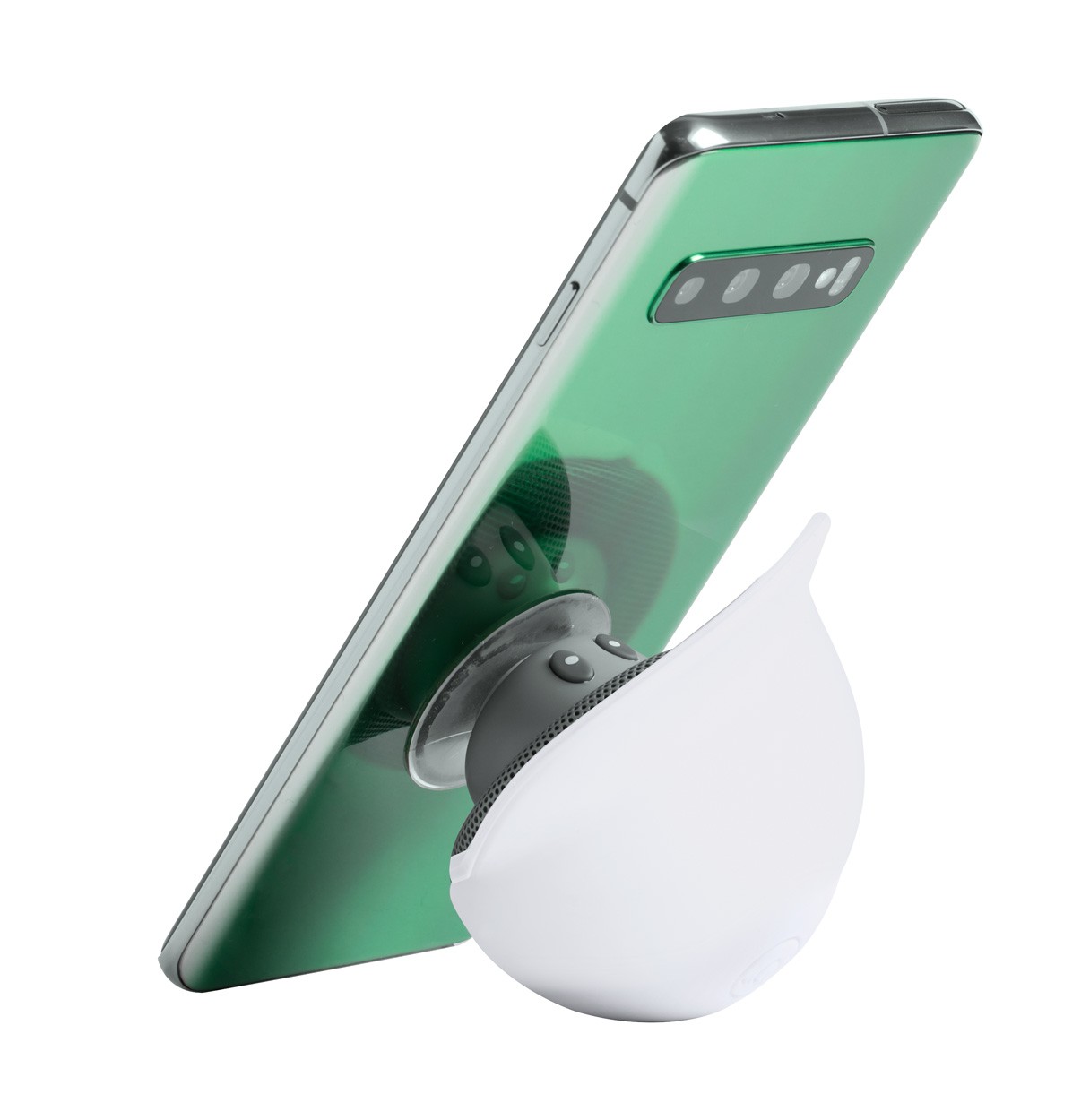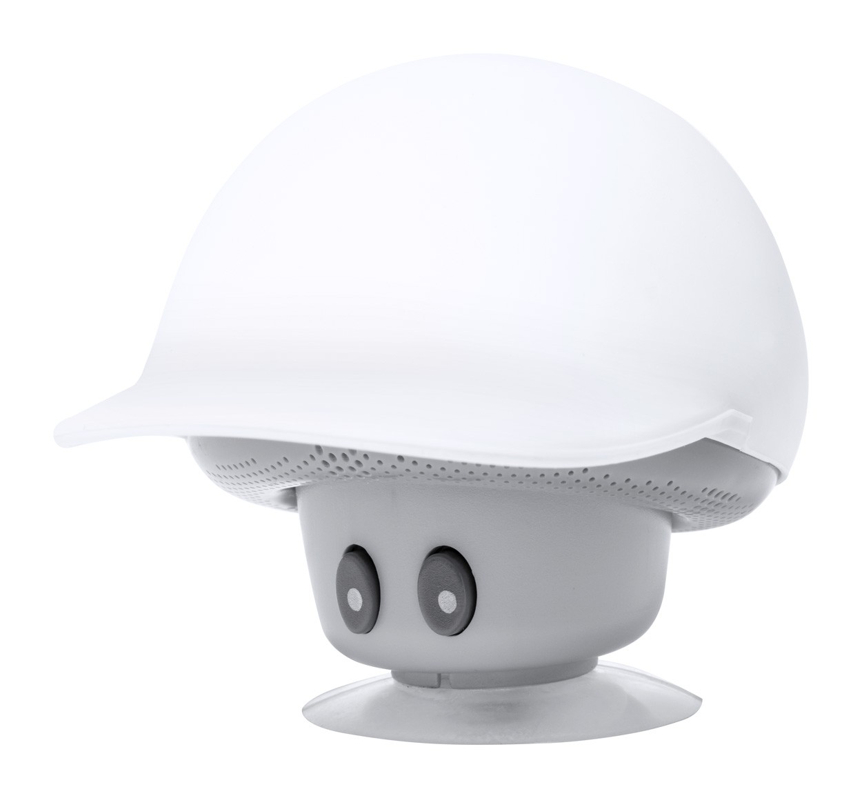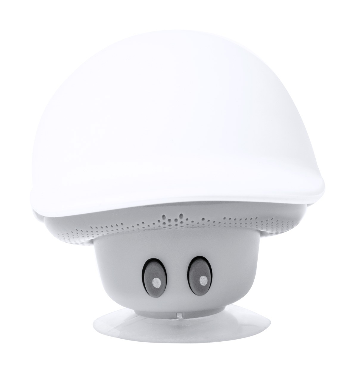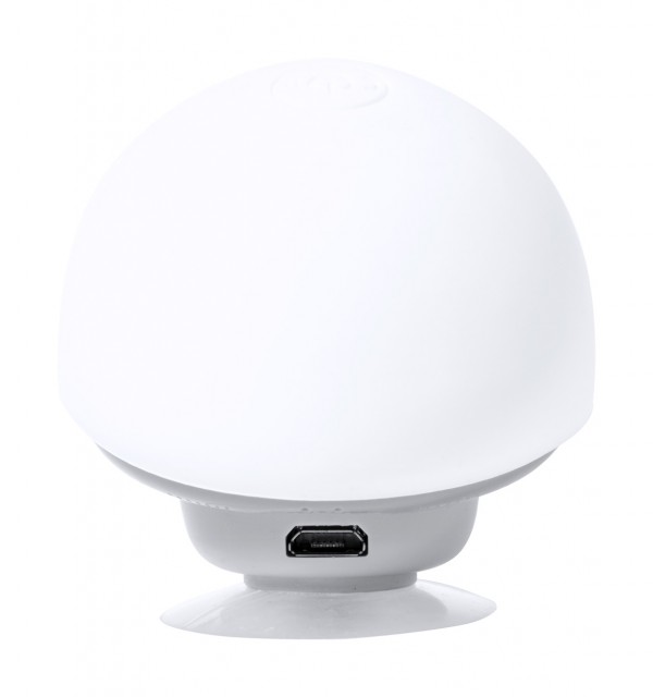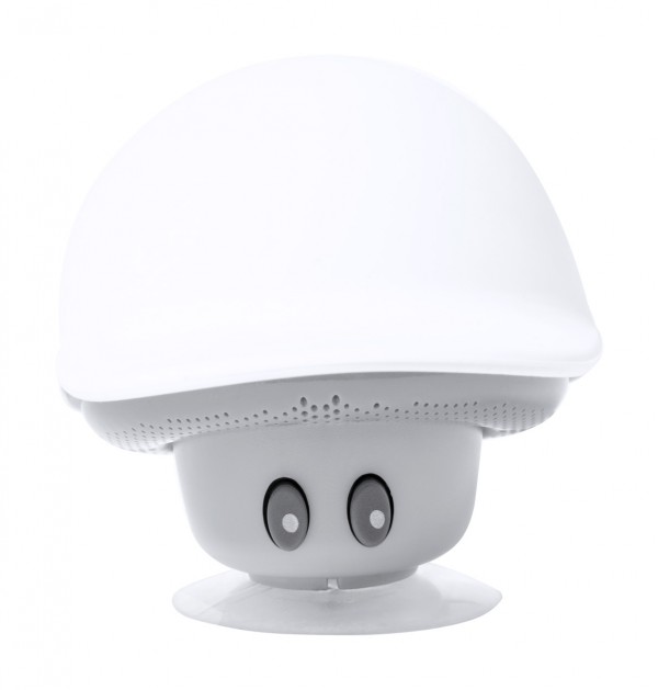 Mushroom shaped mini bluetooth speaker with suction cup, hands-free call function and rechargeable battery. Including USB charger cable.