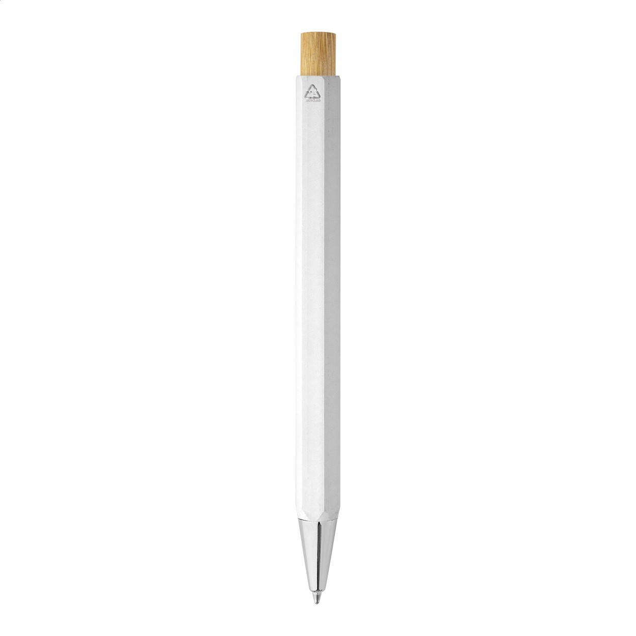 Pix hexagonal, din aluminiu reciclat, cu buton din bambus și piese cromate. Cu mină albastră.