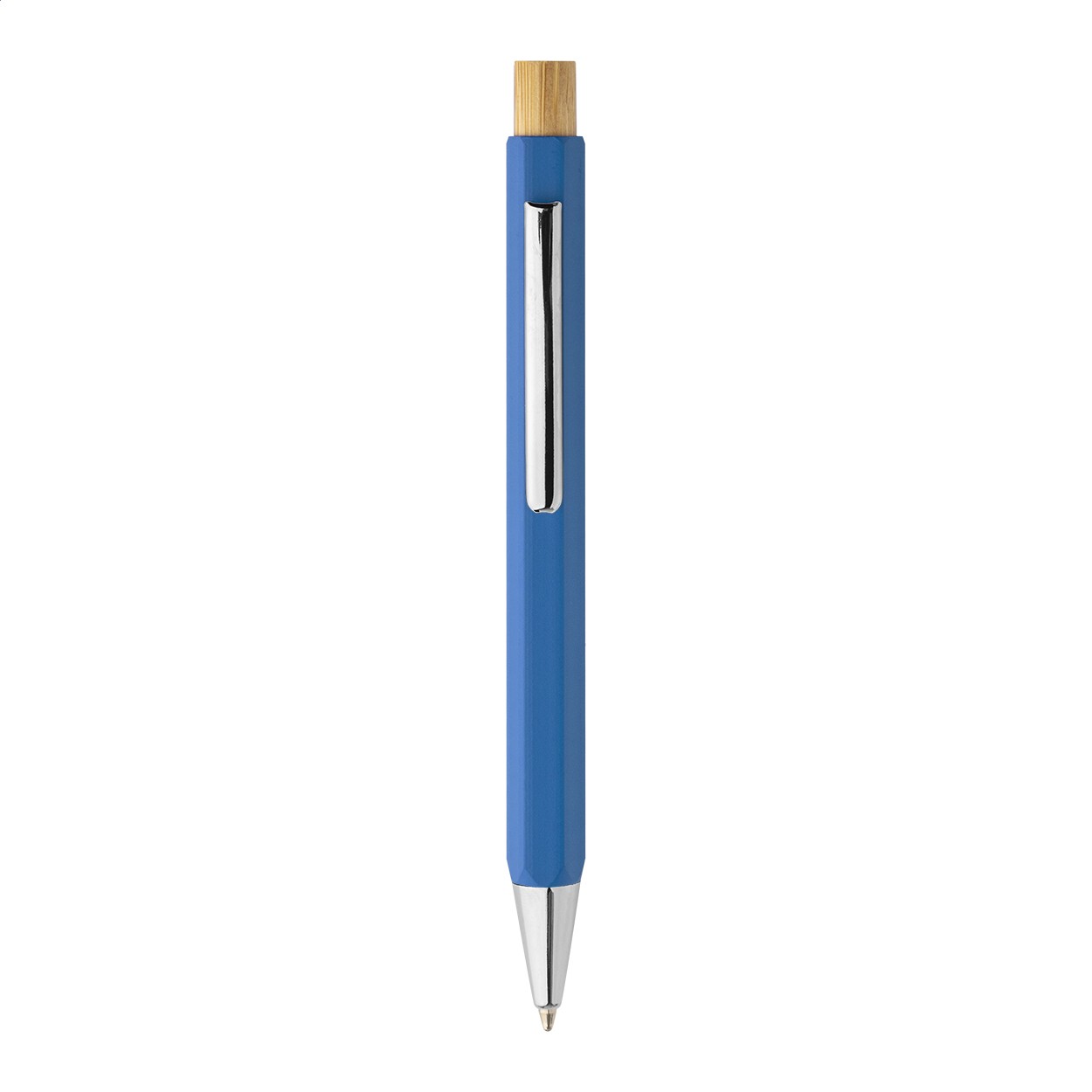 Pix hexagonal, din aluminiu reciclat, cu buton din bambus și piese cromate. Cu mină albastră.