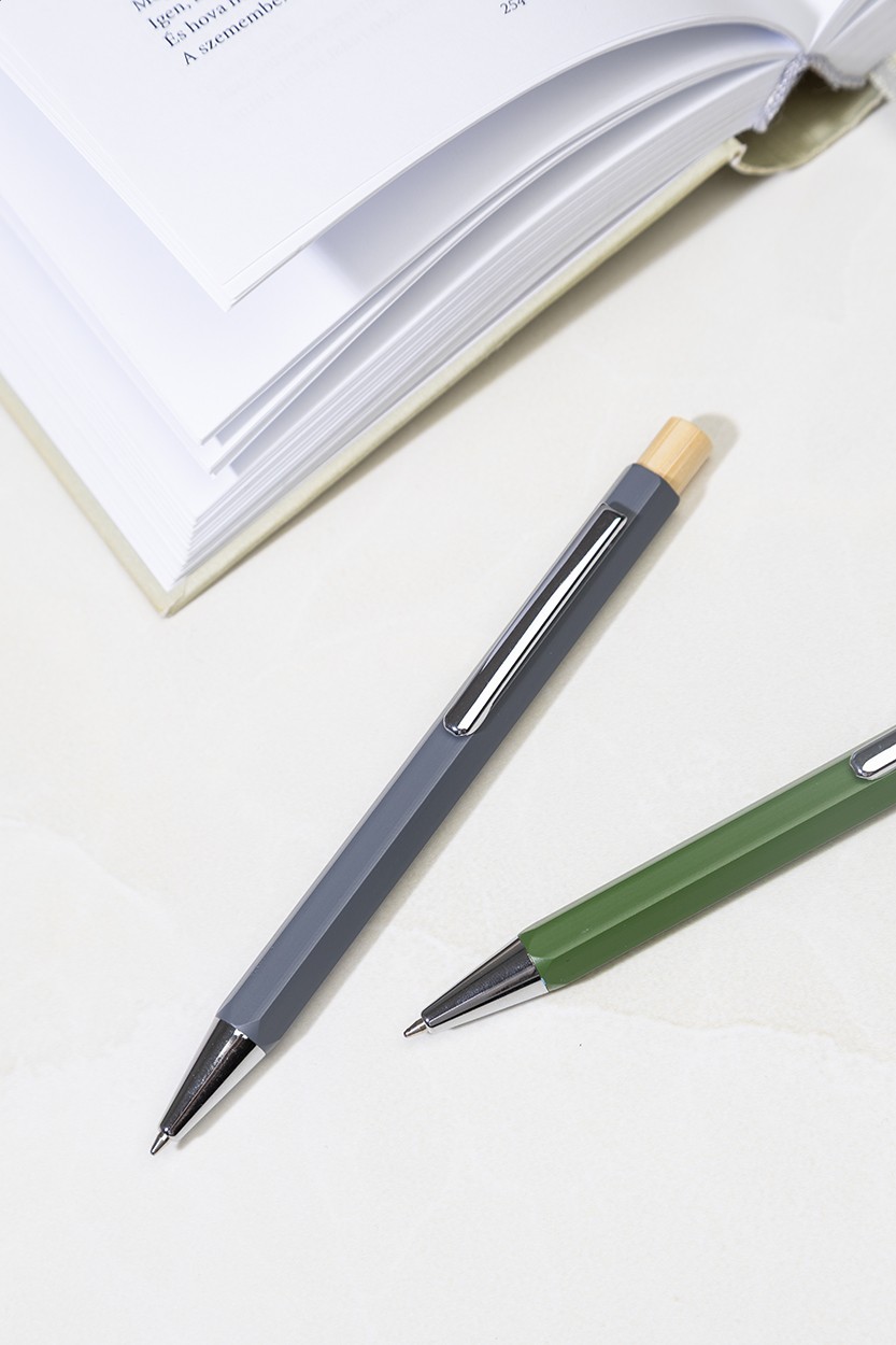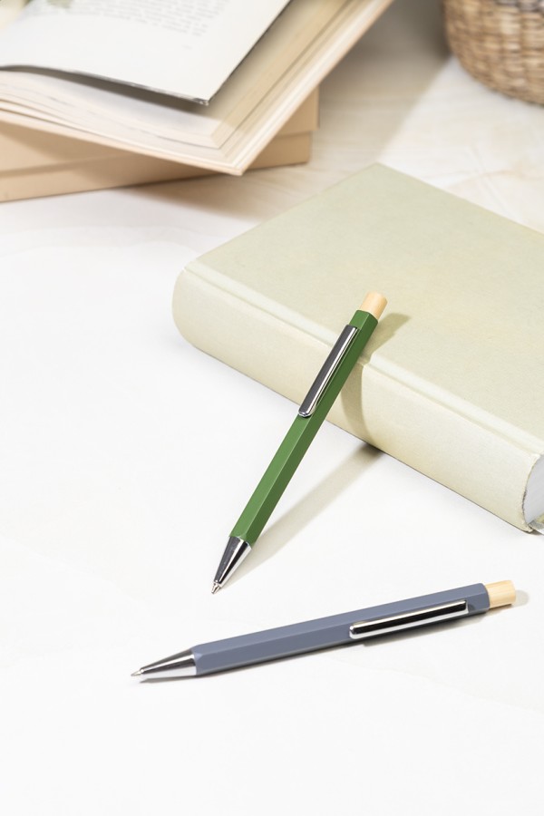 Pix hexagonal, din aluminiu reciclat, cu buton din bambus și piese cromate. Cu mină albastră.