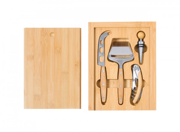 Set cuțit de brânză și accesorii pentru vin din oțel inoxidabil, cu mâner din bambus, în cutie de bambus. Inclusiv tirbușon, dop de vin, cuțit, feliator de brânză și capac pentru tocător