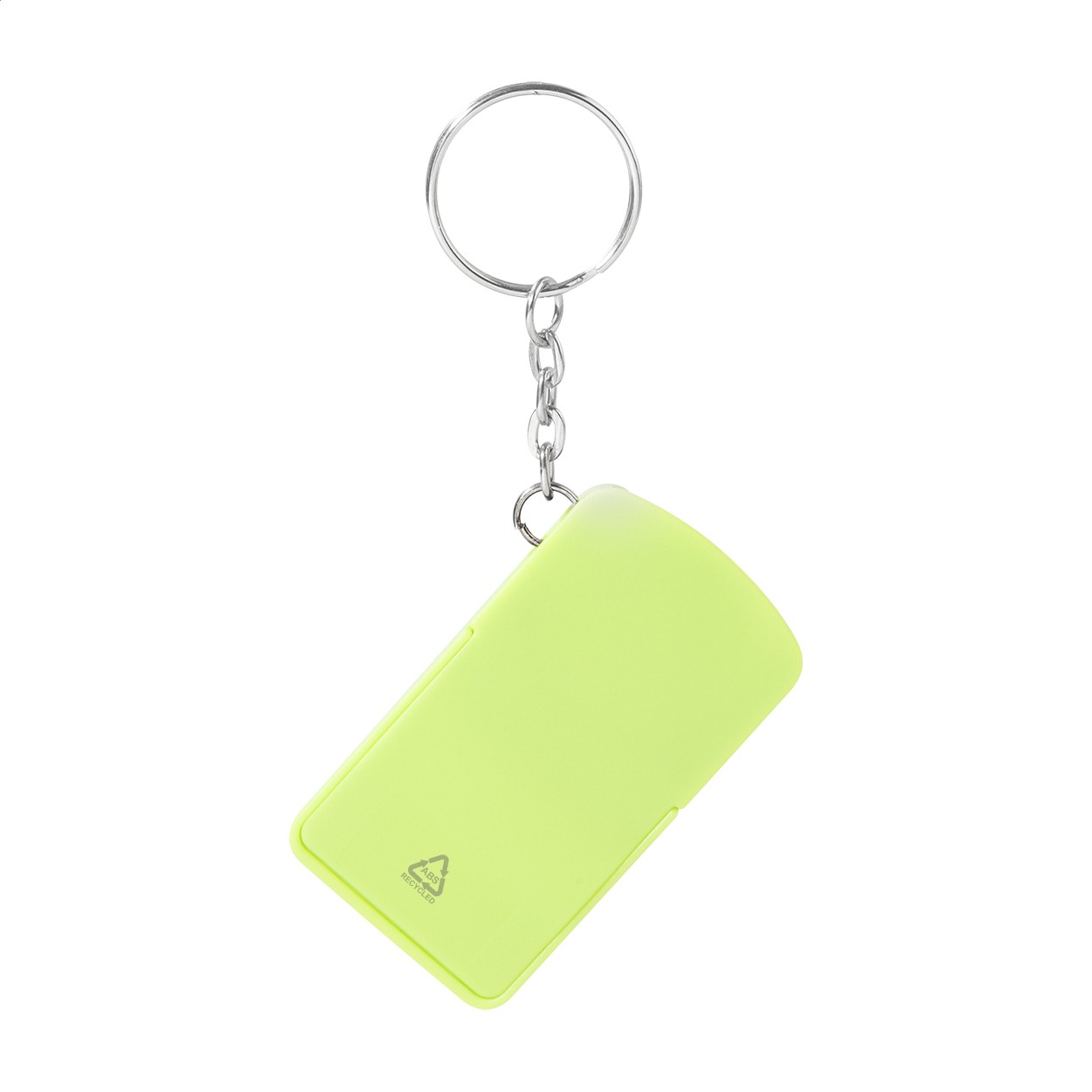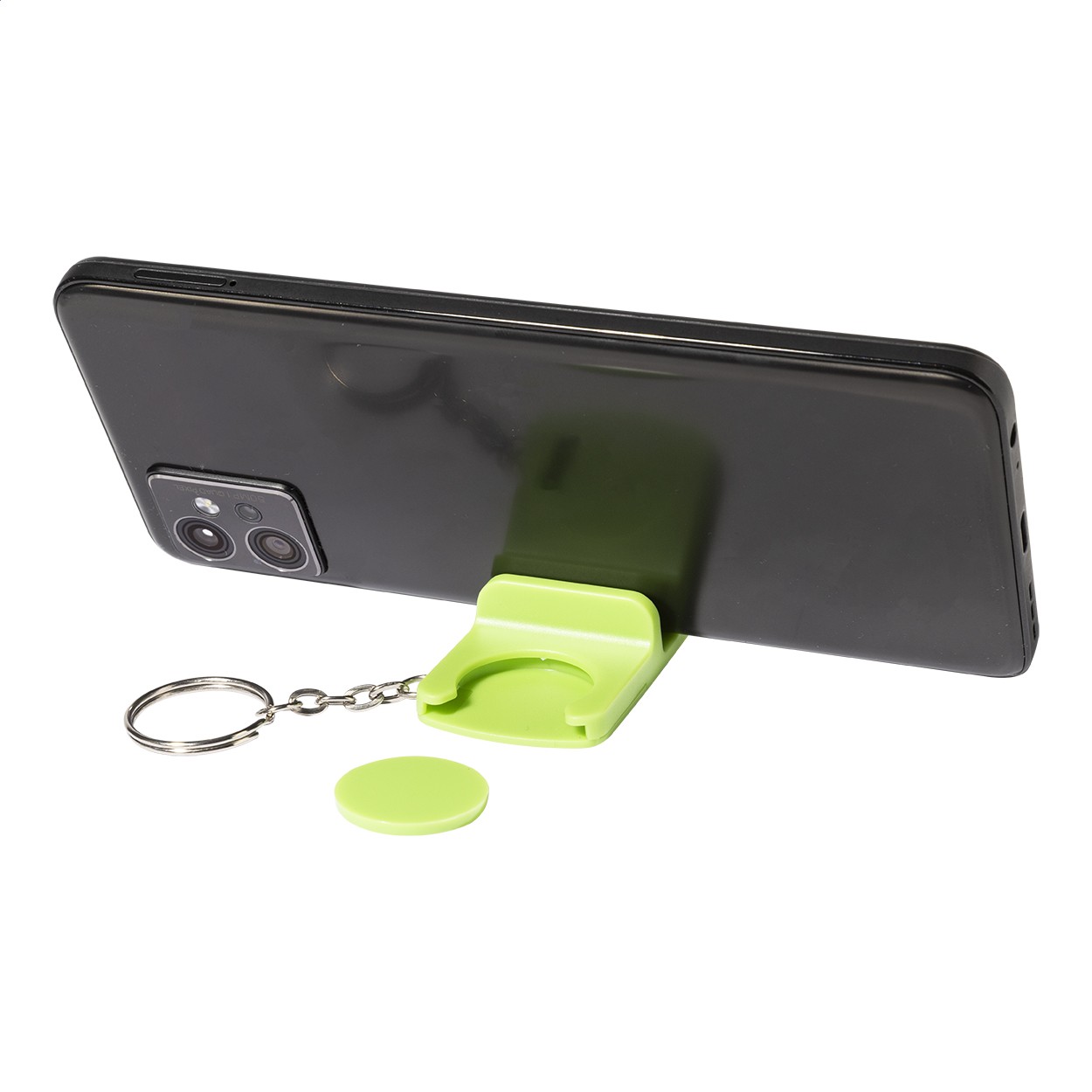 Breloc pentru monede de cărucior, din ABS reciclat, cu suport pentru telefon mobil. Dimensiunea monedei: ø23×2 mm.