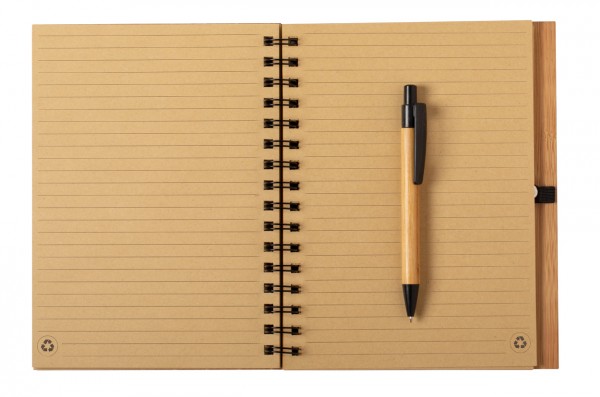 Carnețel spiralat B7 cu copertă din bambus. Pix din bambus cu mină neagră. 80 file dictando.