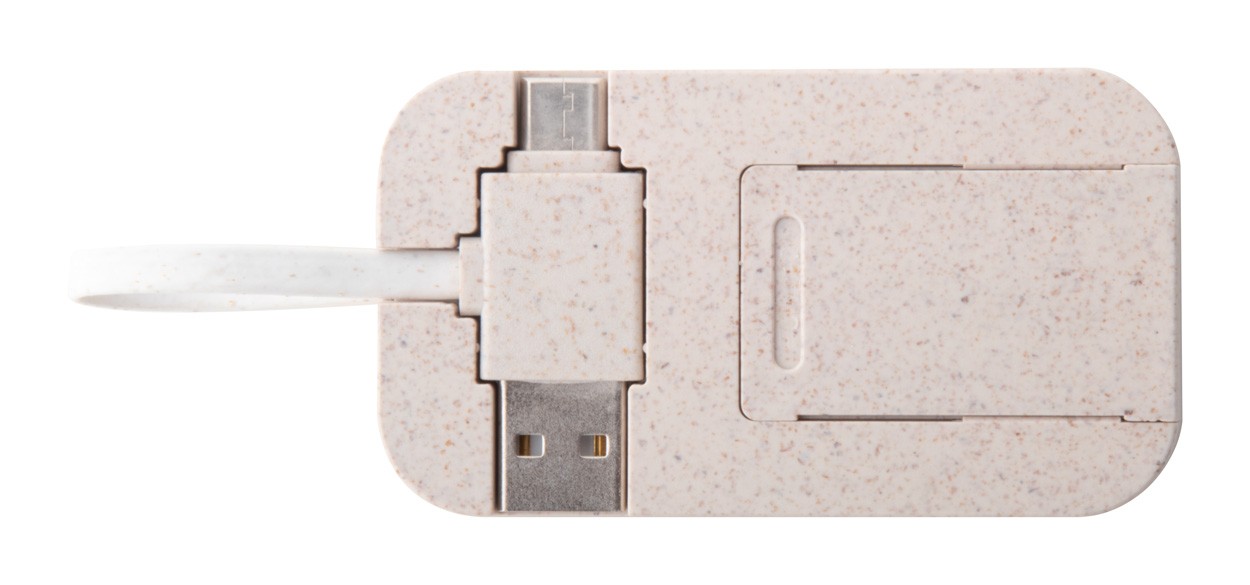 Hub USB din bambus și plastic din paie ecologice de grâu, cu functie de suport mobil. Cu 2 porturi USB și 2 porturi USB-C, USB 2.0. Inclusiv cablu cu conexiuni USB și USB-C.