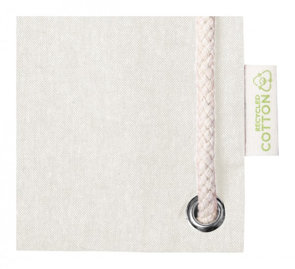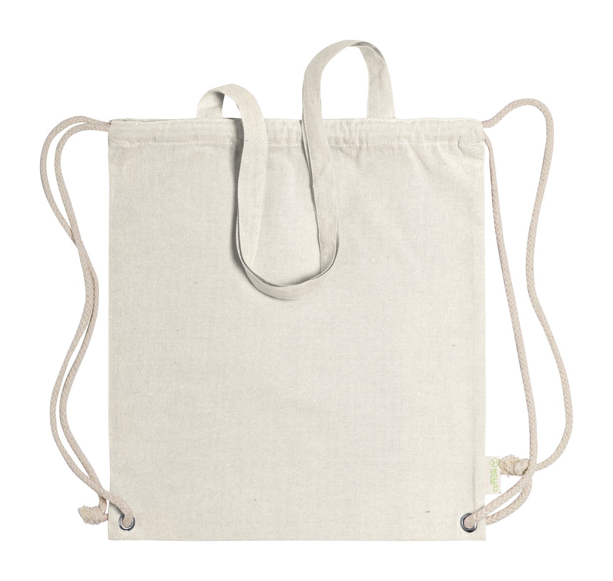 Rucsac tip sac, din bumbac reciclat, cu cordoane împletite groase și mânere lungi. Acesta poate fi, de asemenea, utilizat ca un sac de cumpărături. 100% bumbac reciclat, 140 g/m².