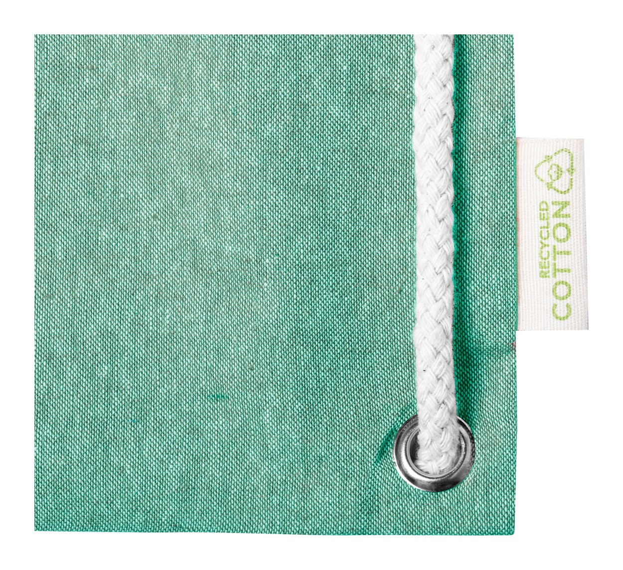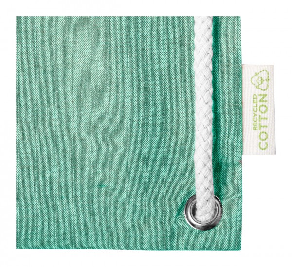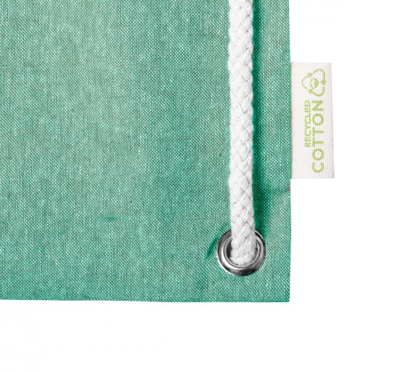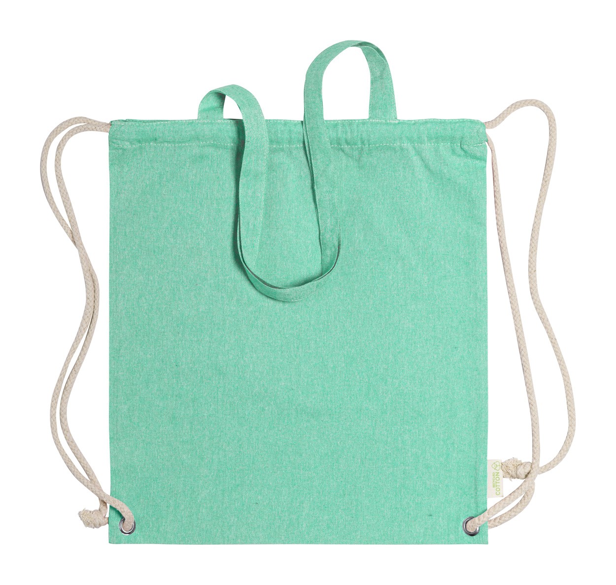Rucsac tip sac, din bumbac reciclat, cu cordoane împletite groase și mânere lungi. Acesta poate fi, de asemenea, utilizat ca un sac de cumpărături. 100% bumbac reciclat, 140 g/m².