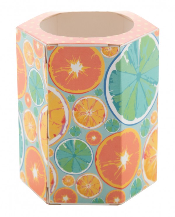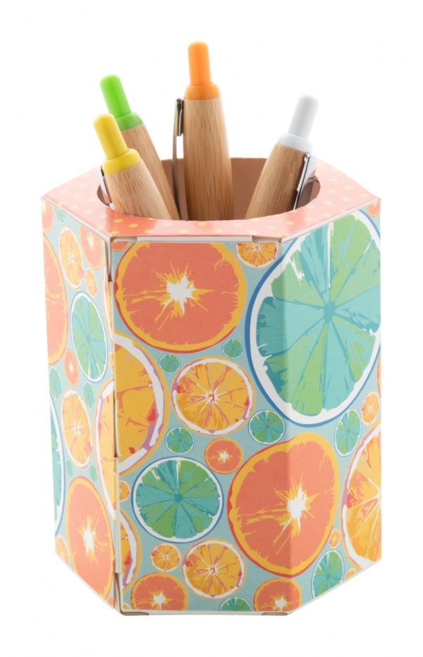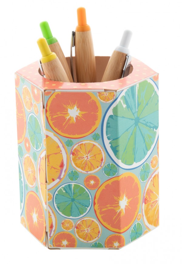 Suport hexagonal personalizat pentru pixuri, din hârtie. Prețul include imprimarea full colour. Cantitate minimă de comandă: 100 buc.