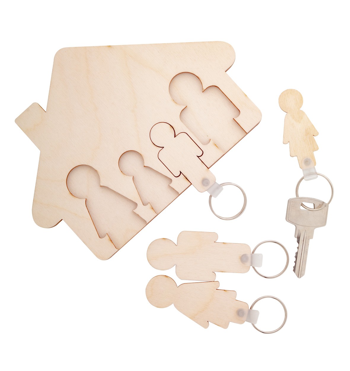 Suport chei de perete, în formă de casă, cu 4 brelocuri detașabile în design de familie. Fabricat din placaj de mesteacăn.