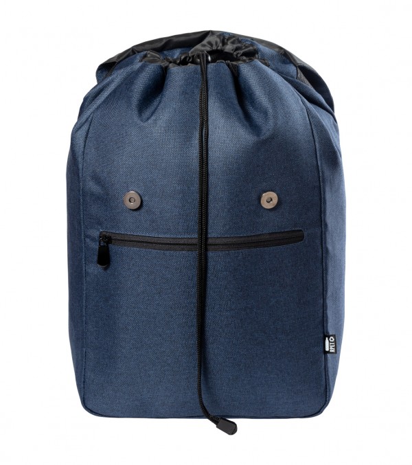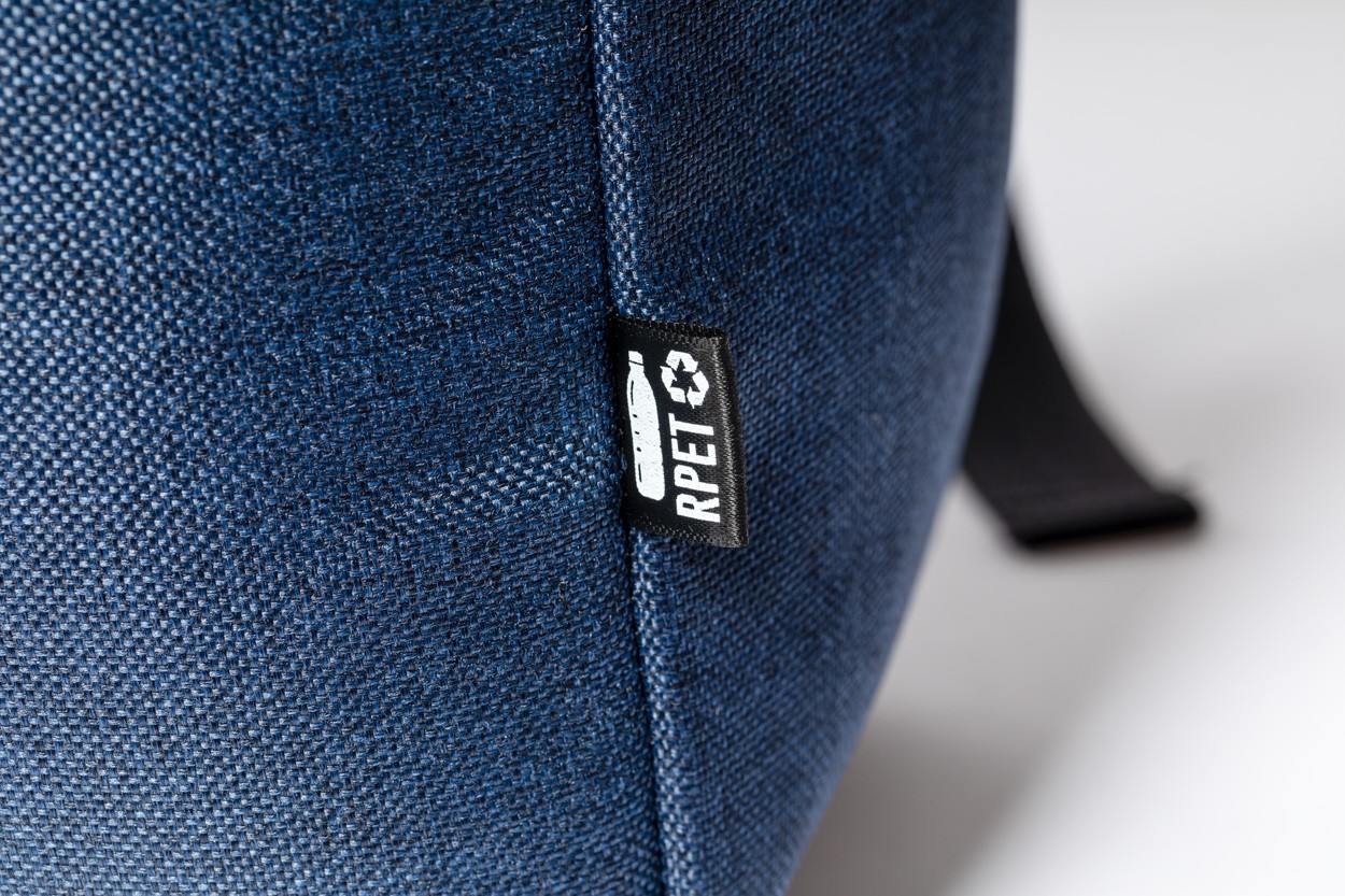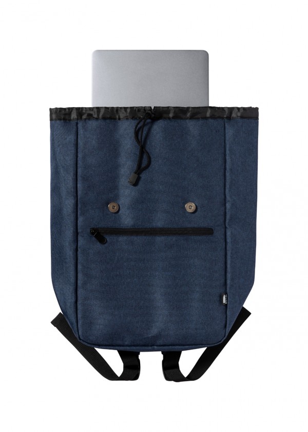 Rucsac RPET cu compartiment căptușit pentru laptop (15") și tabletă (12"), buzunar frontal cu fermoar, spate căptușit și bretele de umăr. Compartiment principal cu șnur și închidere cu buton magnetic. Poliester 300D RPET. Cu etichetă distinctivă RPET.