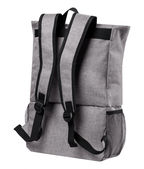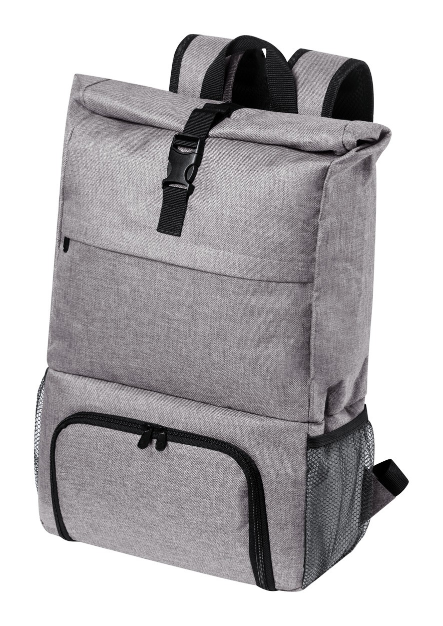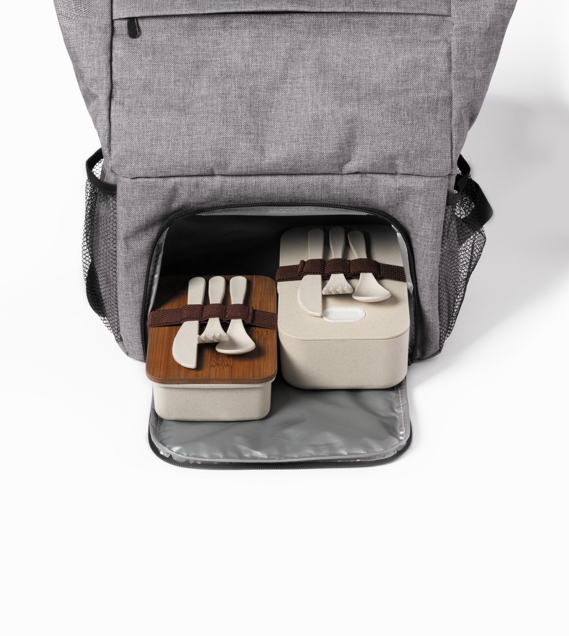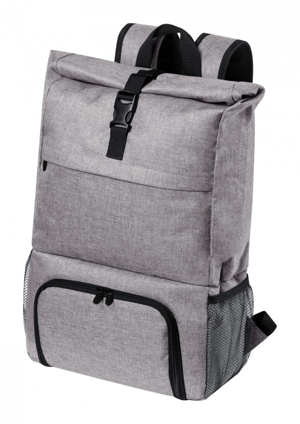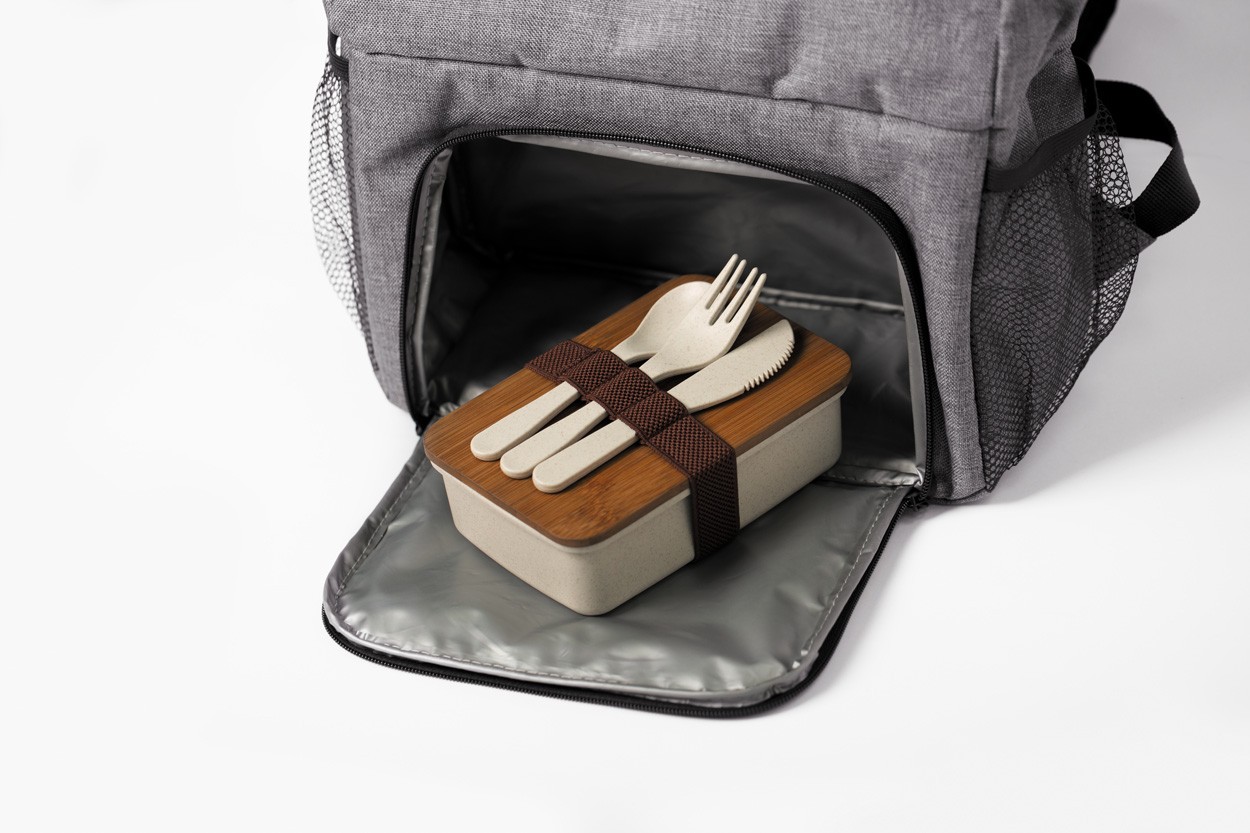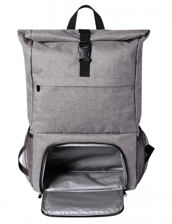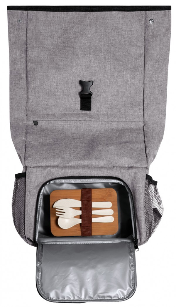 Rucsac cu compartiment termiozolant căptușit cu PEVA pentru cutia de prânz, compartiment principal cu închidere cataramă de siguranță, buzunare laterale cu plasă și bretele căptușite. Poliester 600D.