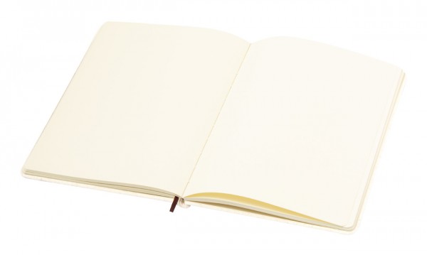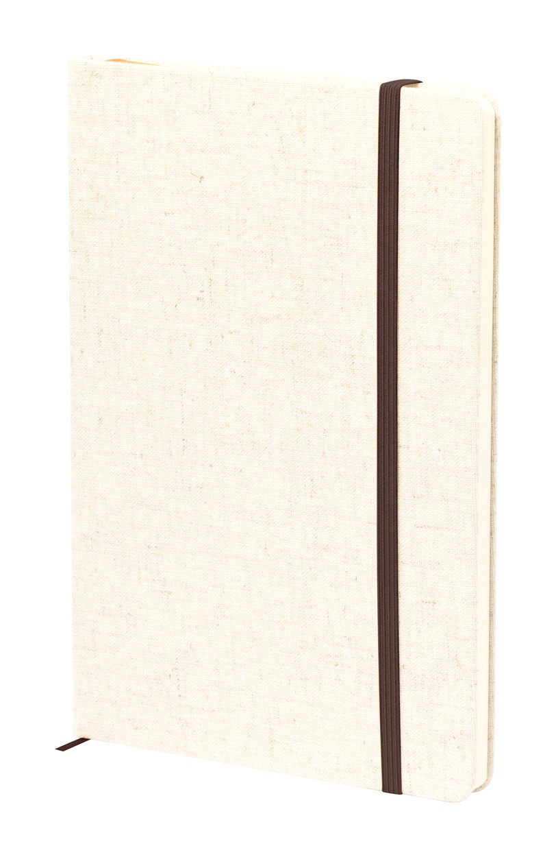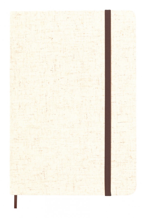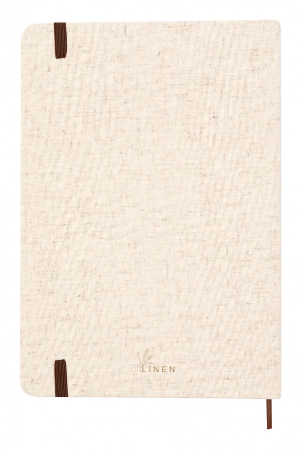 Linen covered notebook with 80 blank sheets, elastic band and bookmark. A5 size.