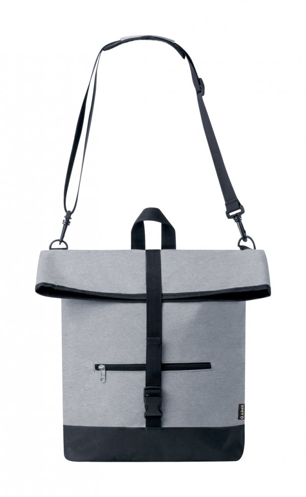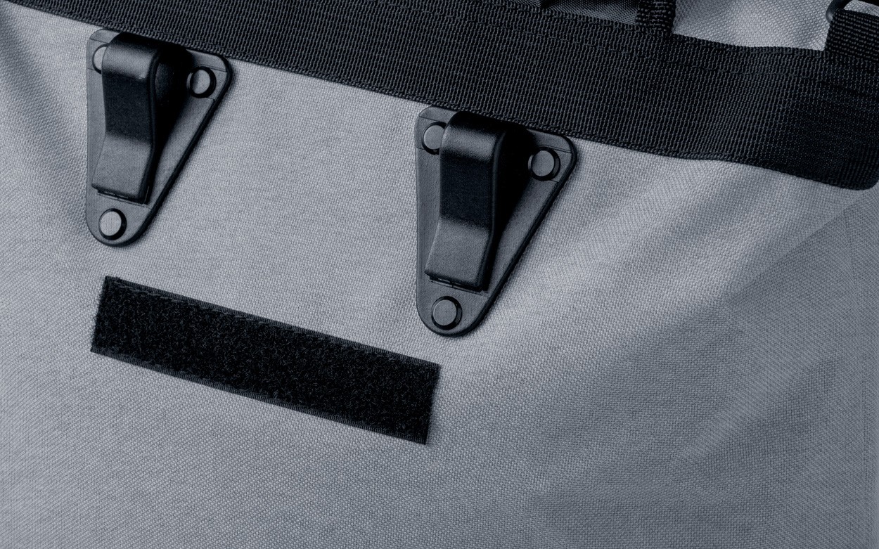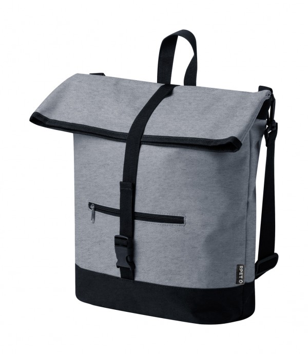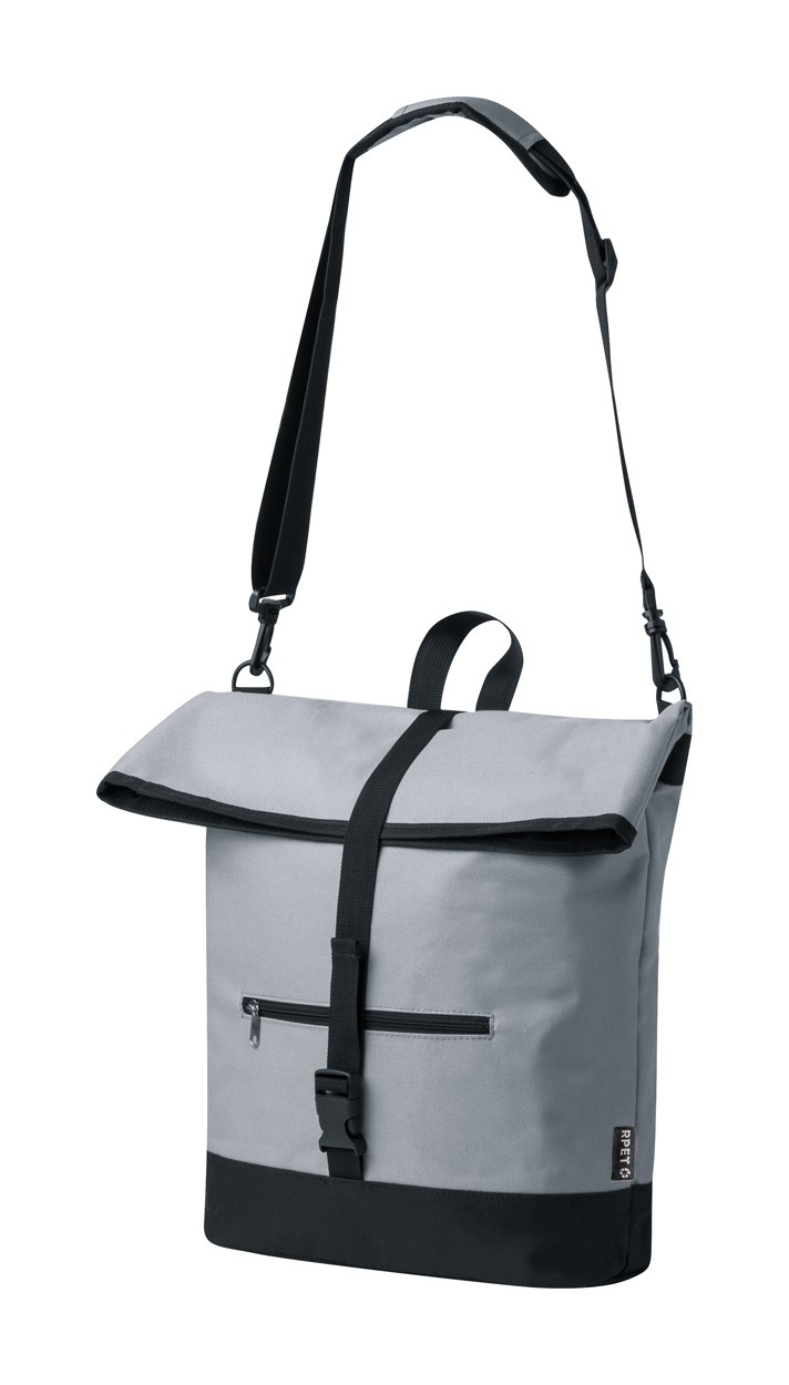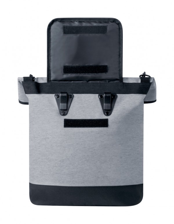 Geantă pentru bicicletă, din poliester 600D RPET, cu buzunar frontal cu fermoar, închidere cu cataramă și curea de umăr reglabilă.