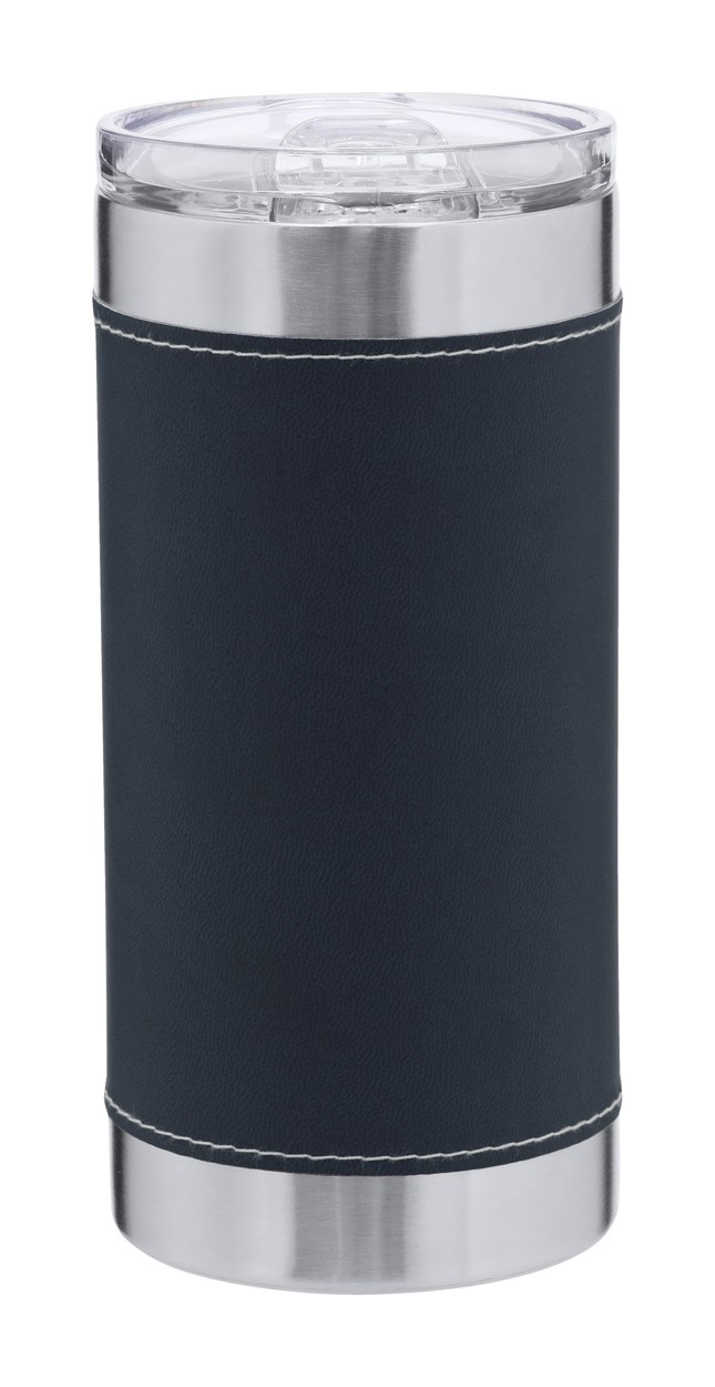 Cană termoizolată, din oțel inoxidabil, cu perete dublu, acoperită cu piele PU, cu capac de băut, 530 ml. Izolația menține băuturile calde timp de 3 ore și reci timp de 6 ore.