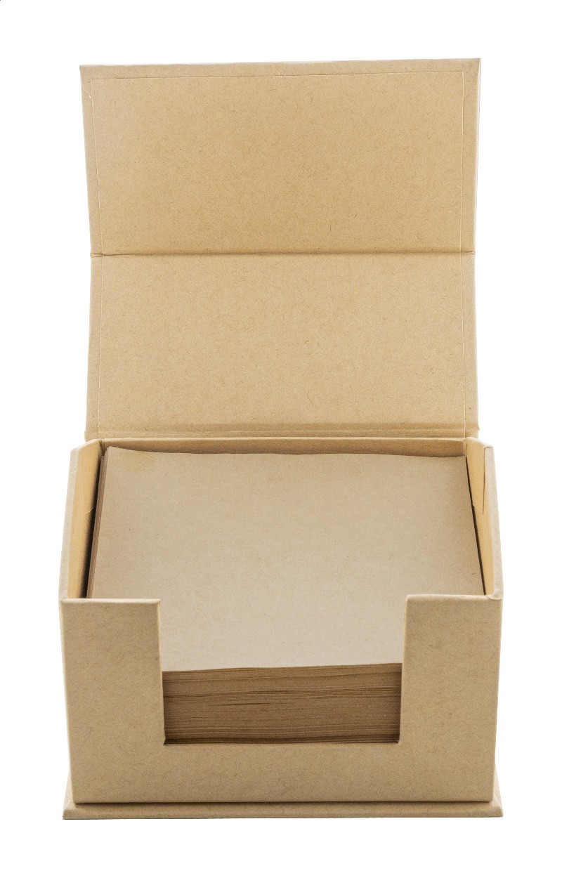 Dispenser de bilețele, în formă de casă, din carton reciclat, cu bloc de notițe din hârtie kraft reciclată, cu o capacitate de 300 de coli. Include 25 de bilețele autoadezive galbene și 100 de markere (în 4 culori) în partea de sus.